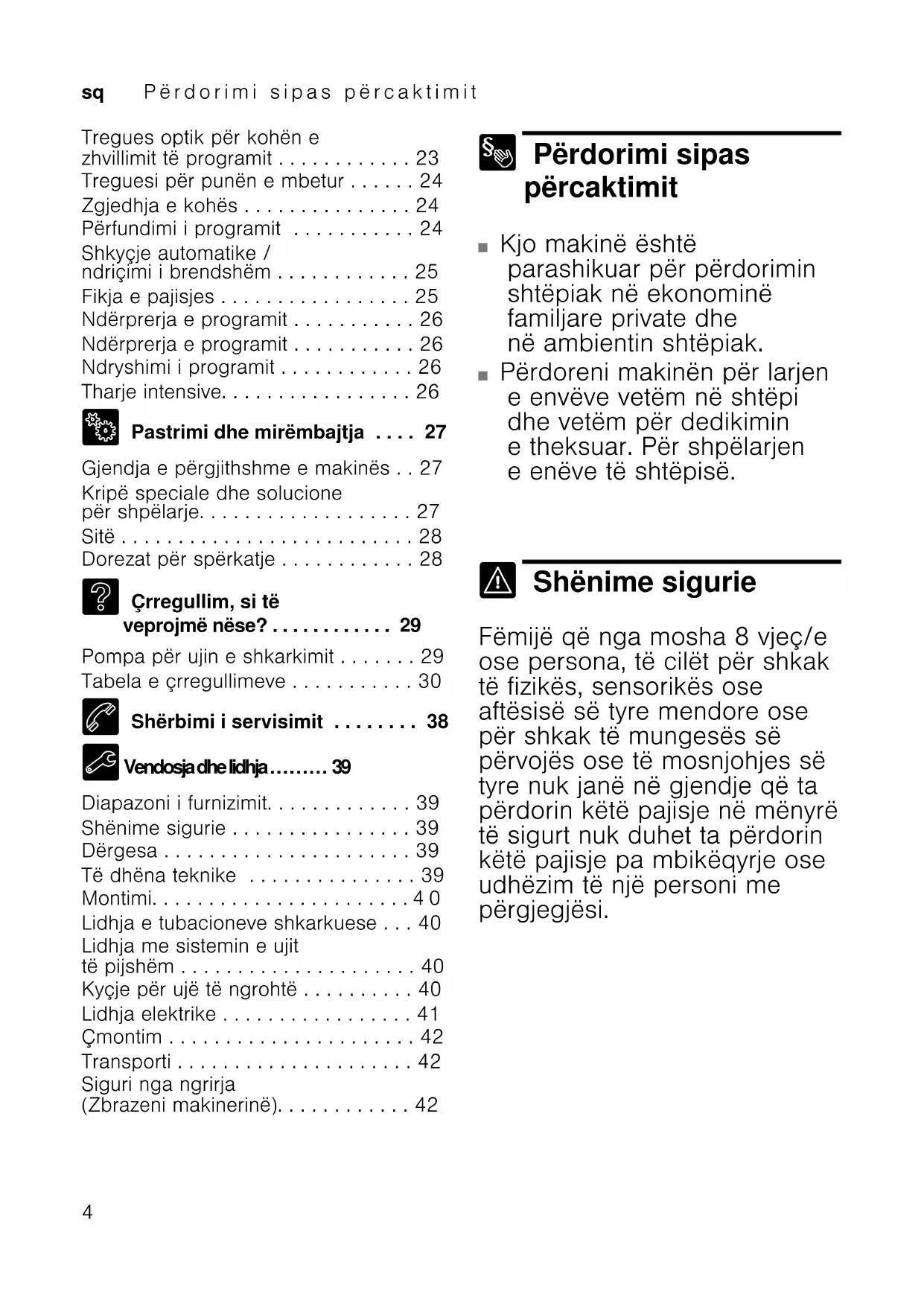 - Siguri nga ngrirja (Zbrazeni makinerinë) Përdorimi sipas përcaktimit Përdorimi sipas përcaktimit ʋ Kjo makinë është parashikuar për përdorimin shtëpiak në ekonominë familjare private dhe në ambientin shtëpiak. ʋ Përdoreni makinën për larjen e envëve vetëm në shtëpi dhe vetëm për dedikimin e theksuar. Për shpëlarjen e enëve të shtëpisë. Shënime sigurie Shënime sigurie Fëmijë që nga mosha 8 vjeç/e ose persona, të cilët për shkak të fizikës, sensorikës ose aftësisë së tyre mendore ose për shkak të mungesës së përvojës ose të mosnjohjes së tyre nuk janë në gjendje që ta përdorin këtë pajisje në mënyrë të sigurt nuk duhet ta përdorin këtë pajisje pa mbikëqyrje ose udhëzim të një personi me përgjegjësi.Shënime sigurie sq p. 42