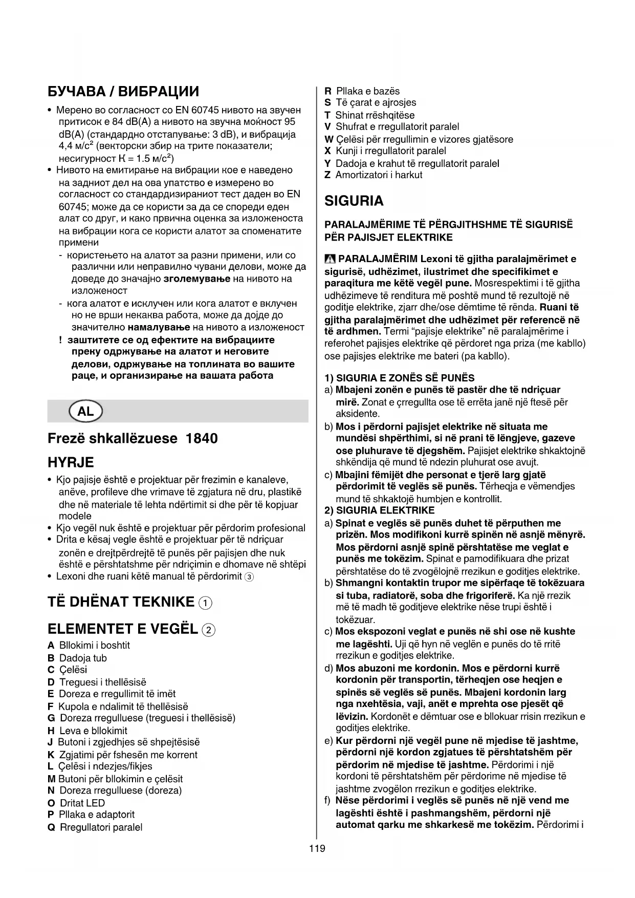 A Bllokimi i boshtit B Dadoja tub C Çelësi D Treguesi i thellësisë E Doreza e rregullimit të imët F Kupola e ndalimit të thellësisë G Doreza rregulluese (treguesi i thellësisë) H Leva e bllokimit J Butoni i zgjedhjes së shpejtësisë K Zgjatimi për fshesën me korrent L Çelësi i ndezjes/fikjes M Butoni për bllokimin e çelësit N Doreza rregulluese (doreza) O Dritat LED P Pllaka e adaptorit Q Rregullatori paralel R Pllaka e bazës S Të çarat e ajrosjes T Shinat rrëshqitëse V Shufrat e rregullatorit paralel W Çelësi për rregullimin e vizores gjatësore X Kunji i rregullatorit paralel Y Dadoja e krahut të rregullatorit paralel Z Amortizatori i harkut SIGURIA PARALAJMËRIME TË PËRGJITHSHME TË SIGURISË