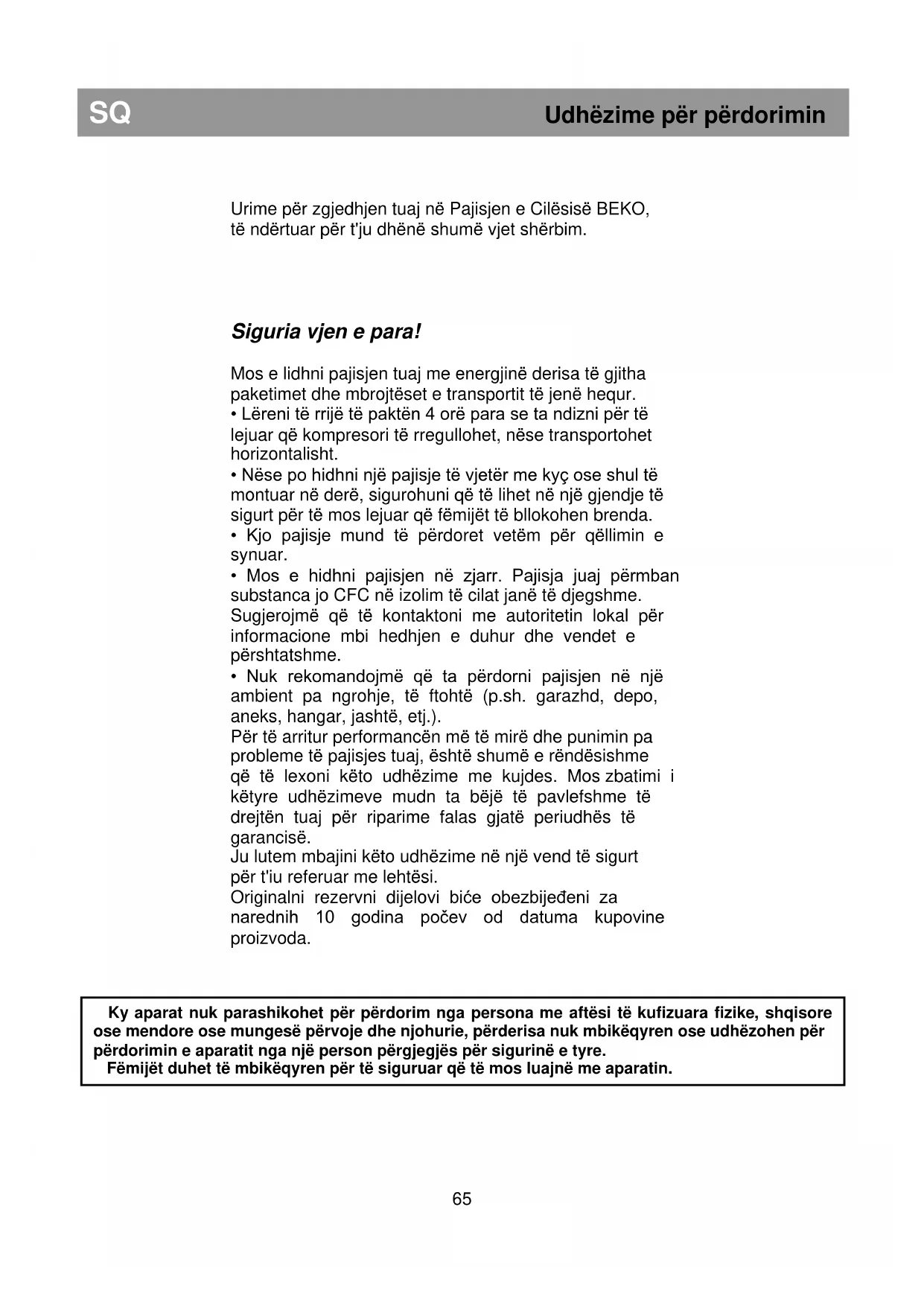 Ky aparat nuk parashikohet për përdorim nga persona me aftësi të kufizuara fizike, shqisore ose mendore ose mungesë përvoje dhe njohurie, përderisa nuk mbikëqyren ose udhëzohen për përdorimin e aparatit nga një person përgjegjës për sigurinë e tyre. Fëmijët duhet të mbikëqyren për të siguruar që të mos luajnë me aparatin.SQ Udhëzime për përdorimin Kërkesat elektrike Para se ta vendosni spinën në prizën në mur sigurohuni që tensioni dhe frekuenca e treguar në etiketën e vlerave të përkasë me atë të rrjetit tuaj elektrik. Rekomandojmë që kjo pajisje të lidhet me energjinë elektrike me një prizë të përshtatshme me çelës dhe siguresë në një pozicion që arrihet me lehtësi. Spina duhet të arrihet me lehtësi pas instalimit me qëllim që të lejojë shkëputjen e pajisjes nga energjia pas instalimit. Paralajmërim! Kjo pajisje duhet të jetë e tokëzuar. Riparimet në pajisjet elektrike mund të bëhen vetëm nga ekspertë të kualifikuar. Nëse kablli i energjisë është dëmtuar, prodhuesi ose kujdesi ndaj klientit duhet ta ndërrojë për të shmangur rreziqet. KUJDES! Kjo pajisje punon me R600a i cili është një gaz i padëmshëm për mjedisin por i djegshëm. Gjatë transportit dhe fiksimit të produktit, duhet të tregohet kujdes të mos dëmtohet sistemi i ftohjes. Nëse sistemi i ftohjes është dëmtuar dhe ka rrjedhje gazi nga sistemi, mbajeni produktin larg nga burimet e flakëve dhe ajroseni dhomën për njëfarë kohe. PARALAJMËRIM - Mos përdorni pajisje mekanike ose mjete të tjera për të përshpejtuar procesin e shkrirjes, përveç atyre të rekomanduara nga prodhuesi. PARALAJMËRIM - Mos e dëmtoni qarkun ftohës. PARALAJMËRIM - Mos përdorni aparate elektrike brenda vendeve të pajisjes për mbajtjen e ushqimeve të parekomanduara nga prodhuesi. PARALAJMËRIM - Nëse kablli i energjisë është dëmtuar, ai duhet të ndërrohet nga prodhuesi, agjenti i tij i shërbimit ose persona të ngjashëm të kualifikuar për të shmangur rreziqet. Udhëzime transporti