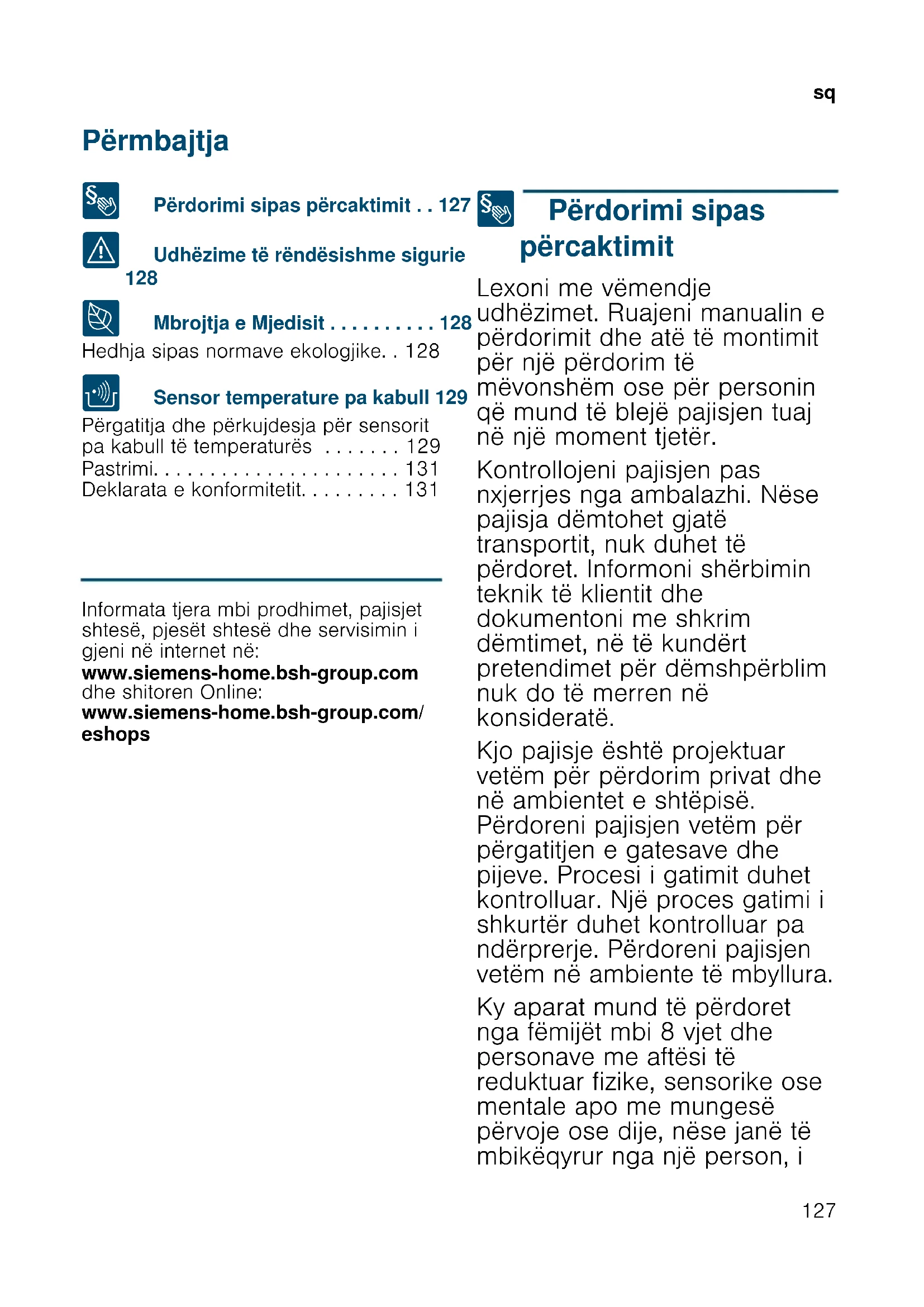 - Deklarata e konformitetit Informacione mbi prodhimin Informata tjera mbi prodhimet, pajisjet shtesë, pjesët shtesë dhe servisimin i gjeni në internet në: www.siemens-home.bsh-group.com dhe shitoren Online: www.siemens-home.bsh-group.com/ eshops 8 Përdorimi sipas përcaktimit Përdorimi sipas përcaktimit Lexoni me vëmendje udhëzimet. Ruajeni manualin e përdorimit dhe atë të montimit për një përdorim të mëvonshëm ose për personin që mund të blejë pajisjen tuaj në një moment tjetër. Kontrollojeni pajisjen pas nxjerrjes nga ambalazhi. Nëse pajisja dëmtohet gjatë transportit, nuk duhet të përdoret. Informoni shërbimin teknik të klientit dhe dokumentoni me shkrim dëmtimet, në të kundërt pretendimet për dëmshpërblim nuk do të merren në konsideratë. Kjo pajisje është projektuar vetëm për përdorim privat dhe në ambientet e shtëpisë. Përdoreni pajisjen vetëm për përgatitjen e gatesave dhe pijeve. Procesi i gatimit duhet kontrolluar. Një proces gatimi i shkurtër duhet kontrolluar pa ndërprerje. Përdoreni pajisjen vetëm në ambiente të mbyllura. Ky aparat mund të përdoret nga fëmijët mbi 8 vjet dhe personave me aftësi të reduktuar fizike, sensorike ose mentale apo me mungesë përvoje ose dije, nëse janë të mbikëqyrur nga një person, isq p. 131