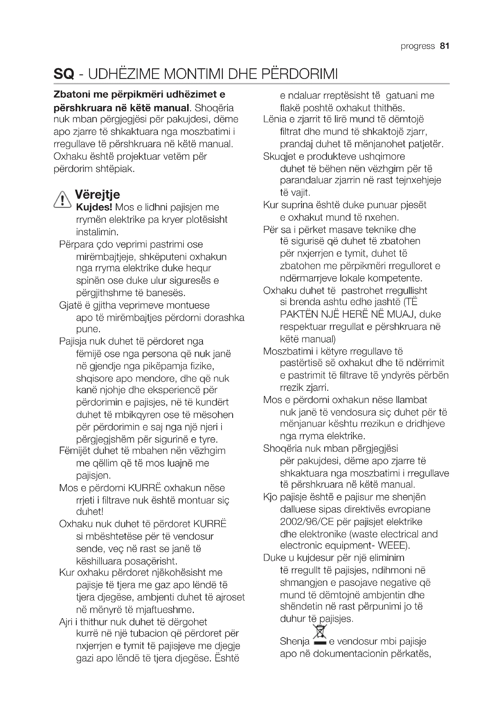 480 progress Maščobni fi lter Sl. 1-16 Očistiti ga je treba enkrat mesečno (ali takrat, ko sistem, ki zaznava zasičenost fi ltrov – če je na modelu, ki je v vaši lasti, predviden – opozori na to potrebo), z ne agresivnimi detergenti, ročno ali v pomivalnem stroju pri nizki temperaturi s kratkim ciklom. S pranjem v pomivalnem stroju se maščobni fi lter lahko razbarva, toda njegove fi ltrirne značilnosti se nikakor ne spremenijo. Ogleni fi lter (samo za obtočno različico) Sl. 15 Type 20 LONG LIFE - Pralni fi lter z ak- tivnim ogljem Ogleni fi lter se lahko opere vsake dva meseca v topli vodi in ustreznimi čistilnimi sredstvi ali v pomivalnem stroju pri 65°C (v primeru pranja v pomivalnem stroju izvedite popoln pralni cikel brez posode v stroju). Odstranite odvečno vodo, ne da bi pri tem poškodovali fi lter, nato snemite vložek, ki se nahaja v notranjosti plastičnega ogrodja in ga dajte v peč za 10 minut na temperaturi 100°C, da ga v celoti posušite. Vložek zamenjajte vsaka 3 leta in vsakič, ko na njem odkrijete poškodbe. Type 15 - Nepralni fi lter z aktivnim ogljem Ogleni fi lter je potrebno zamenjati po daljši uporabi, glede na tip kuhe ter redno čiščenje maščobnega fi ltra. Vsekakor je potrebno zamenjati vložek najmanj vsake štiri mesece. Filter ni niti pralen niti obnovljiv. Zamenjava žarnic Slika 32 Izključite električno napajanje naprave. Pozor! Preden se žarnic dotaknete, se prepričajte, ali so hladne. Uporabljajte le halogene žarnice v obliki sveče Ø35mm E14 28W.progress 81 SQ - UDHËZIME MONTIMI DHE PËRDORIMI Zbatoni me përpikmëri udhëzimet e përshkruara në këtë manual. Shoqëria nuk mban përgjegjësi për pakujdesi, dëme apo zjarre të shkaktuara nga moszbatimi i rregullave të përshkruara në këtë manual. Oxhaku është projektuar vetëm për përdorim shtëpiak. Vërejtje Kujdes! Mos e lidhni pajisjen me rrymën elektrike pa kryer plotësisht instalimin. Përpara çdo veprimi pastrimi ose mirëmbajtjeje, shkëputeni oxhakun nga rryma elektrike duke hequr spinën ose duke ulur siguresës e përgjithshme të banesës. Gjatë ë gjitha veprimeve montuese apo të mirëmbajtjes përdorni dorashka pune. Pajisja nuk duhet të përdoret nga fëmijë ose nga persona që nuk janë në gjendje nga pikëpamja fizike, shqisore apo mendore, dhe që nuk kanë njohje dhe eksperiencë për përdorimin e pajisjes, në të kundërt duhet të mbikqyren ose të mësohen për përdorimin e saj nga një njeri i përgjegjshëm për sigurinë e tyre. Fëmijët duhet të mbahen nën vëzhgim me qëllim që të mos luajnë me pajisjen. Mos e përdorni KURRË oxhakun nëse rrjeti i filtrave nuk është montuar siç duhet! Oxhaku nuk duhet të përdoret KURRË si mbështetëse për të vendosur sende, veç në rast se janë të këshilluara posaçërisht. Kur oxhaku përdoret njëkohësisht me pajisje të tjera me gaz apo lëndë të tjera djegëse, ambjenti duhet të ajroset në mënyrë të mjaftueshme. Ajri i thithur nuk duhet të dërgohet kurrë në një tubacion që përdoret për nxjerrjen e tymit të pajisjeve me djegje gazi apo lëndë të tjera djegëse. Është e ndaluar rreptësisht të gatuani me flakë poshtë oxhakut thithës. Lënia e zjarrit të lirë mund të dëmtojë filtrat dhe mund të shkaktojë zjarr, prandaj duhet të mënjanohet patjetër. Skuqjet e produkteve ushqimore duhet të bëhen nën vëzhgim për të parandaluar zjarrin në rast tejnxehjeje të vajit. Kur suprina është duke punuar pjesët e oxhakut mund të nxehen. Për sa i përket masave teknike dhe të sigurisë që duhet të zbatohen për nxjerrjen e tymit, duhet të zbatohen me përpikmëri rregulloret e ndërmarrjeve lokale kompetente. Oxhaku duhet të pastrohet rregullisht si brenda ashtu edhe jashtë (TË PAKTËN NJË HERË NË MUAJ, duke respektuar rregullat e përshkruara në këtë manual) Moszbatimi i këtyre rregullave të pastërtisë së oxhakut dhe të ndërrimit e pastrimit të filtrave të yndyrës përbën rrezik zjarri. Mos e përdorni oxhakun nëse llambat nuk janë të vendosura siç duhet për të mënjanuar kështu rrezikun e dridhjeve nga rryma elektrike. Shoqëria nuk mban përgjegjësi për pakujdesi, dëme apo zjarre të shkaktuara nga moszbatimi i rregullave të përshkruara në këtë manual. Kjo pajisje është e pajisur me shenjën dalluese sipas direktivës evropiane 2002/96/CE për pajisjet elektrike dhe elektronike (waste electrical and electronic equipment- WEEE). Duke u kujdesur për një eliminim të rregullt të pajisjes, ndihmoni në shmangjen e pasojave negative që mund të dëmtojnë ambjentin dhe shëndetin në rast përpunimi jo të duhur të pajisjes. Shenja e vendosur mbi pajisje apo në dokumentacionin përkatës,82 progress tregon se pajisja nuk mund të trajtohet si mbeturinë shtëpiake. Kështu ajo duhet të grumbullohet në qendrën e përcaktuar për riciklimin e pajisjeve elektrike dhe elektronike. Per eliminimin e pajisjeve te tilla duhet të zbatohen rregullat vendore në fuqi për eliminimin e mbeturinave. Për informacione më të hollësishme rreth trajtimit, grumbullimit dhe riciklimit të këtij produkti, ju lutem të lidheni me këshillin tuaj vendor, me shërbimin tuaj të eliminimit të mbeturinave shtëpiake ose me pikëshitjen ku keni blerë pajisjen. Përdorimi Oxhaku është realizuar për t’u përdorur në variantin thithës me shkarkim të jashtëm ose fi ltrues me qarkullim të brendshëm . Montimi Largësia minimale midis sipërfaqes mbështetëse të eneve mbi pllakën e gatimit dhe pjesës më të poshtme të oxhakut thithës duhet të jetë jo më pak se 50cm në rastin e kuzhinave elekrike dhe jo më pak se 65cm në rastin e kuzhinave me gaz apo të përziera. Nëse udhëzimet e instalimit të pllakave të gatimit me gaz përcaktojnë një largësi më të madhe, duhet të mbahet gjithnjë parasysh. Tensioni i rrymës duhet të përkojë me tensionin e treguar në etiketën e vendosur n