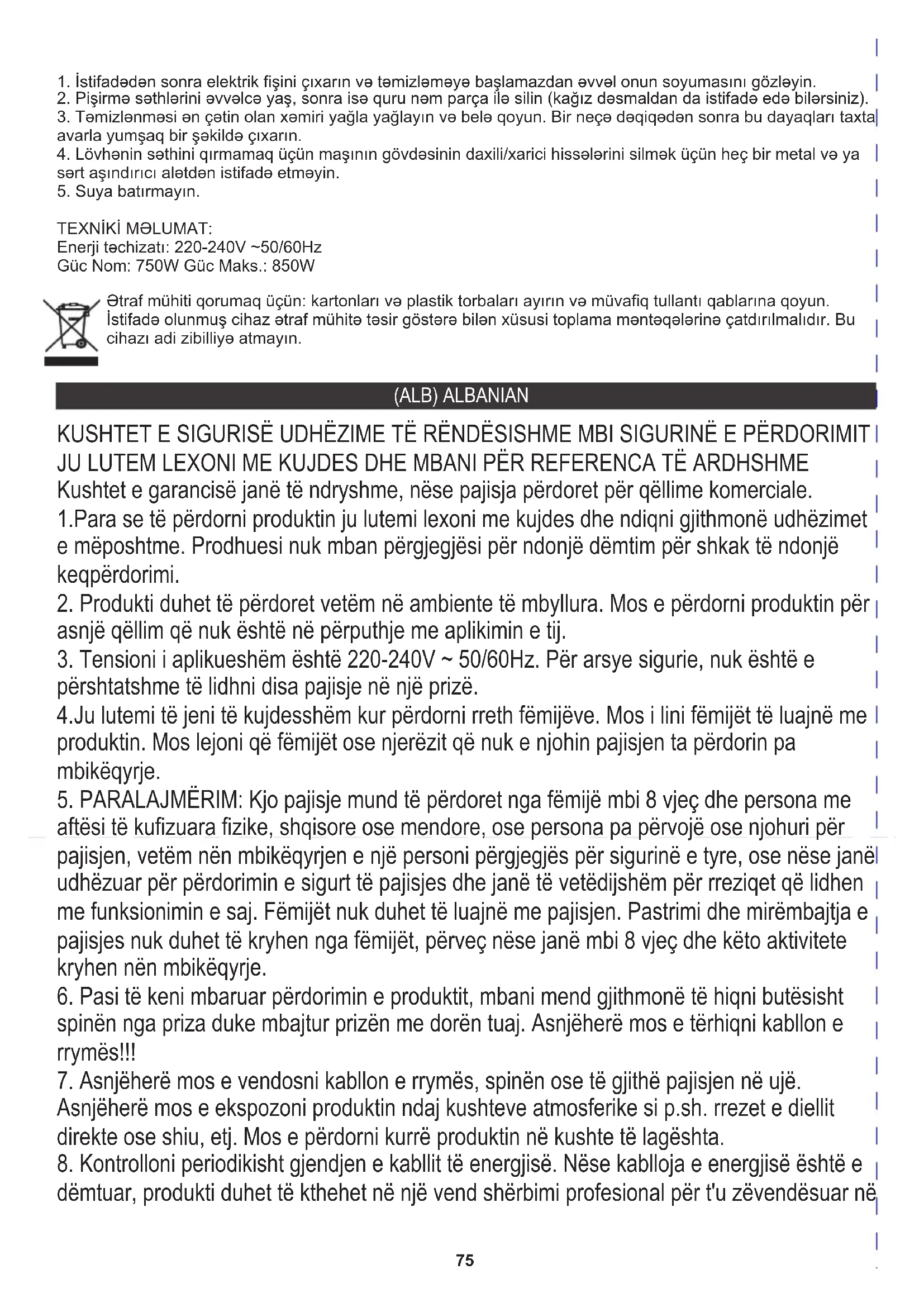 Fuqia nominale: 750 W Fuqia maksimale: 850 W Furnizimi me energji elektrike: 220-240V ~50/60Hz Për të mbrojtur mjedisin: ndani kartonat dhe qeset plastike dhe vendosini në kontejnerët e duhur të mbeturinave. Pajisja e përdorur duhet të dorëzohet në pika të veçanta grumbullimi që mund të ndikojnë në mjedis. Mos e hidhni këtë pajisje në mbeturina normale.78