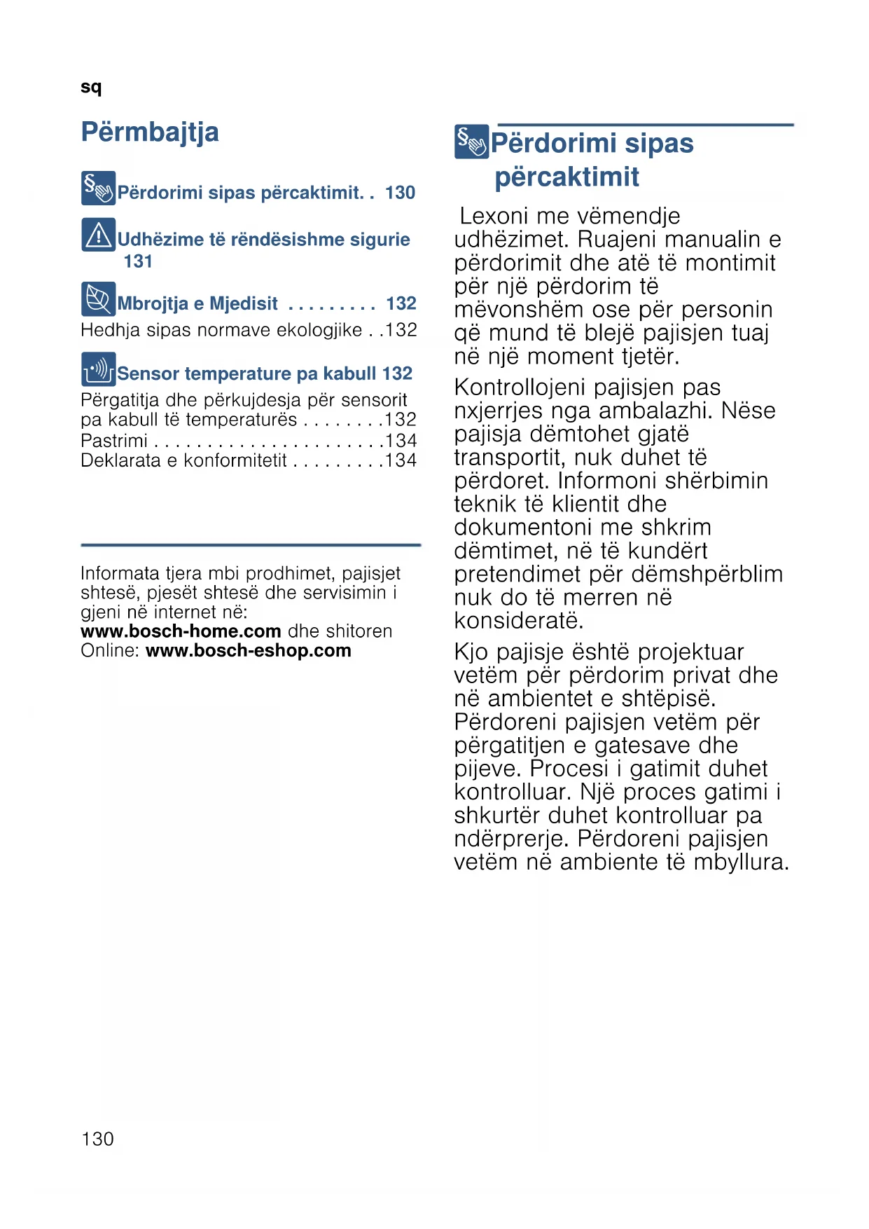 Përmbajtja sqUd h ë z i m për për dor i m 8 Përdorimi sipas përcaktimit. . 130 ( Udhëzime të rëndësishme sigurie