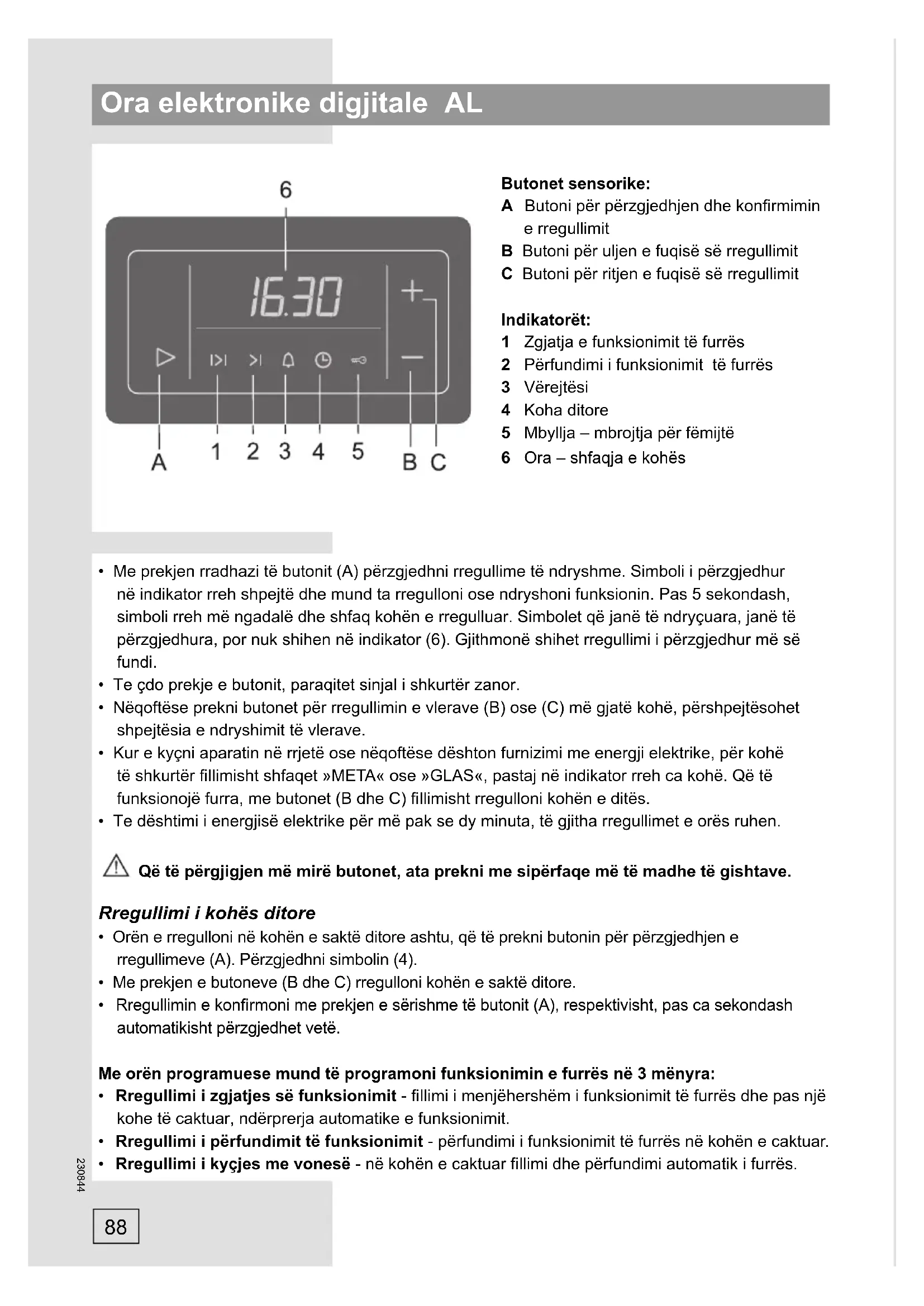 Butonet sensorike: A Butoni për përzgjedhjen dhe konfi rmimin e rregullimit B Butoni për uljen e fuqisë së rregullimit C Butoni për ritjen e fuqisë së rregullimit Indikatorët: 1 Zgjatja e funksionimit të furrës 2 Përfundimi i funksionimit të furrës 3 Vërejtësi 4 Koha ditore 5 Mbyllja – mbrojtja për fëmijtë 6 Ora – shfaqja e kohës