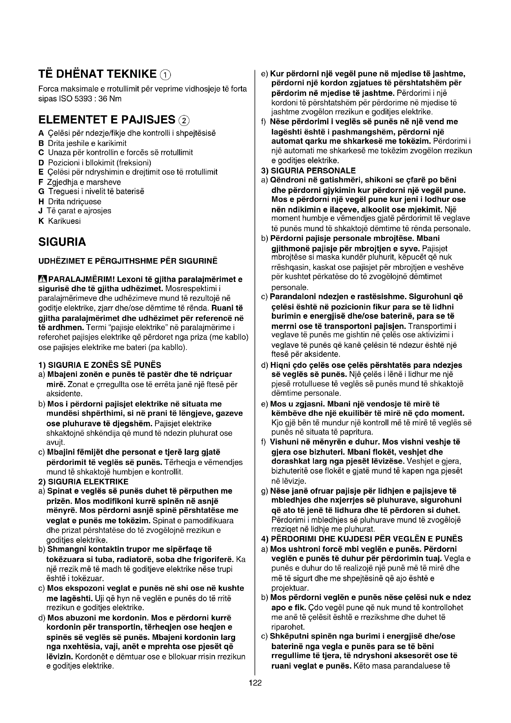 A Çelësi për ndezje/fikje dhe kontrolli i shpejtësisë B Drita jeshile e karikimit C Unaza për kontrollin e forcës së rrotullimit D Pozicioni i bllokimit (freksioni) E Çelësi për ndryshimin e drejtimit ose të rrotullimit F Zgjedhja e marsheve G Treguesi i nivelit të baterisë H Drita ndriçuese J Të çarat e ajrosjes K Karikuesi SIGURIA UDHËZIMET E PËRGJITHSHME PËR SIGURINË PARALAJMËRIM! Lexoni të gjitha paralajmërimet e sigurisë dhe të gjitha udhëzimet. Mosrespektimi i paralajmërimeve dhe udhëzimeve mund të rezultojë në goditje elektrike, zjarr dhe/ose dëmtime të rënda. Ruani të gjitha paralajmërimet dhe udhëzimet për referencë në të ardhmen. Termi “pajisje elektrike” në paralajmërime i referohet pajisjes elektrike që përdoret nga priza (me kabllo) ose pajisjes elektrike me bateri (pa kabllo).