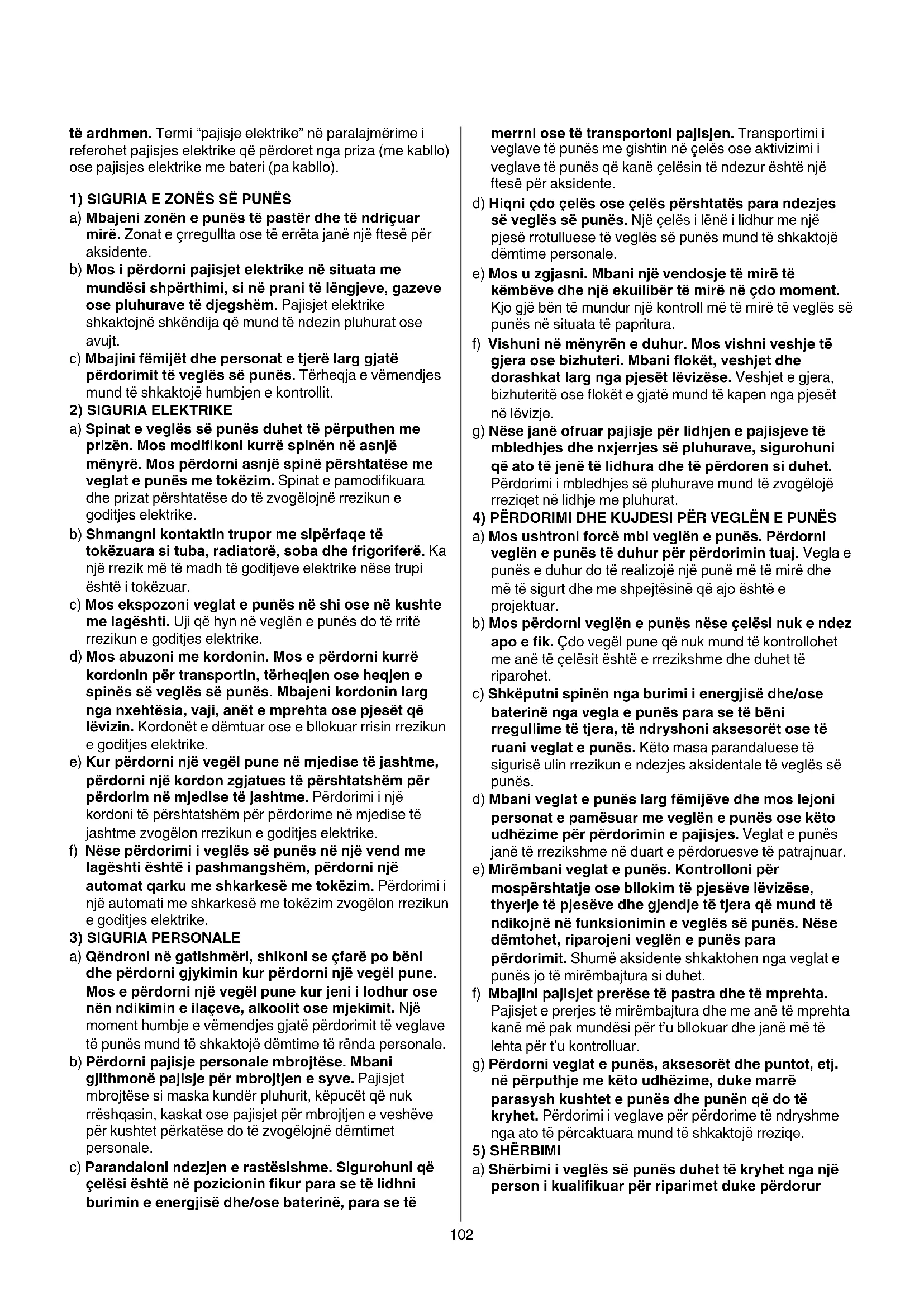 - JO STANDARDE E PËRFSHIRË SIGURIA UDHËZIMET E PËRGJITHSHME PËR SIGURINË PARALAJMËRIM! Lexoni të gjitha paralajmërimet e sigurisë dhe të gjitha udhëzimet. Mosrespektimi i paralajmërimeve dhe udhëzimeve mund të rezultojë në goditje elektrike, zjarr dhe/ose dëmtime të rënda. Ruani të gjitha paralajmërimet dhe udhëzimet për referencë në102 të ardhmen. Termi “pajisje elektrike” në paralajmërime i referohet pajisjes elektrike që përdoret nga priza (me kabllo) ose pajisjes elektrike me bateri (pa kabllo).