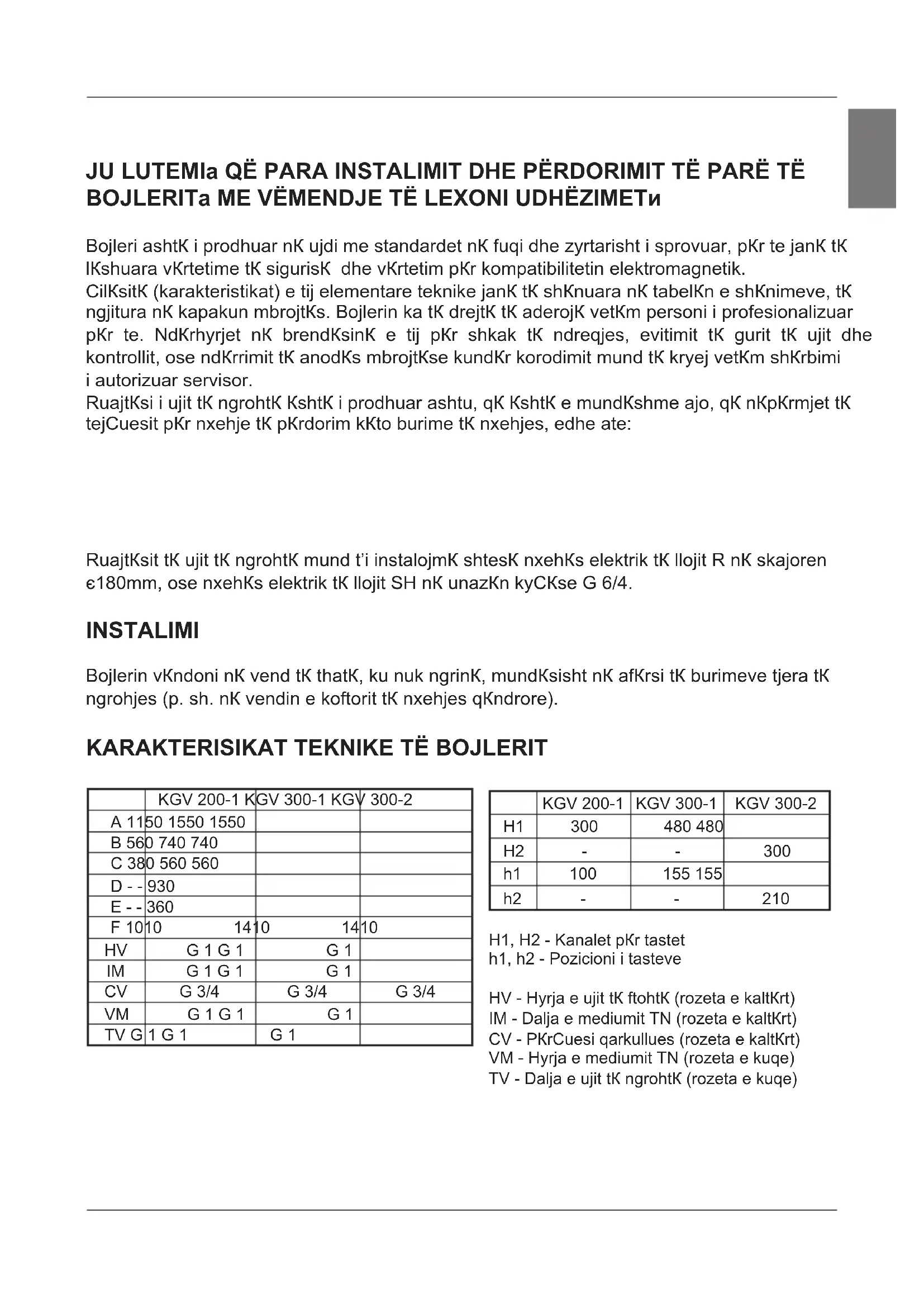 H1 300 480 480 H2 - - 300 h1 100 155 155 h2 - - 210 H1, H2 - Kanalet për tastet h1, h2 - Pozicioni i tasteve HV - Hyrja e ujit të ftohtë (rozeta e kaltërt) IM - Dalja e mediumit TN (rozeta e kaltërt) CV - Përçuesi qarkullues (rozeta e kaltërt) VM - Hyrja e mediumit TN (rozeta e kuqe) TV - Dalja e ujit të ngrohtë (rozeta e kuqe) hsi§ª Tipi KGV 200-1 KGV 300-1 KGV 300-2 Volum [ l ] 200 285 280 Presiune nominală [MPa ] 0,6 Greutate / umplut cu apă [ kg ] 82 / 282 112 / 397 134 / 414 Protecţia anticorozivă a cazanului emailat / Mg anod Spërfaqja ngrohëse TN-i poshtëm [m²] Vëllimi TN-i poshtëm [ l ] Vëllimi TN-i sipërm [ l ] Trashësia e izolimit [mm] 57 Stopień zabezpieczenia IP 21 TN - transmetuesi i ngrohjes Në anën e fundit të ruajtësit të ujit të ngrohtë janë të bëra kanalet për tastet (H1, H2), në të cilët mund të instalohen tastet për rregulimin e lidhjes sistemike të ruajtësit të ujit të ngrohtë me burimet tjera të ngrohjes. Arritshmëria deri te kanalet gjendet nën pikëbashkimin e mbulesës mbrojtëse përafërsisht në gjysmën e lartësisë së ngrohësit të ujit. Tastin e vendoni në kanal dhe e përforconi me çepin e bashkangjitur nga goma. Pozicioni (h1, h2) i rekomanduar i tasteve në kanale është i shenjuar në skicë: - Nëqoftëse do të vendoni tastin më lartë se pozicioni i rekomanduar, termostati do të përgjigjet më shpejtë, kohët e funksionimit të pompës qarkore do të jenë më të shkurtëra, diferenca ndërmjet të temperaturës së ujit në ruajtës dhe mediumit ngrohës pas shkyçjes së termostatit do të jetë më e lartë, e si pasojë e kësaj do të jetë sasia dhe temperatura e ujit të ngrohtë në ruajtës më e ulët, - Nëqoftëse do të vendoni tastin më ulët se pozicioni i rekomanduar, kohët e funksionimit të pompës qarkore do të jenë më të gjata, diferenca ndërmjet të temperaturës së mediumit ngrohës dhe temperaturës së arritur të ujit në ruajtës më e ulët, kurse temperatura dhe me këte sasia e ujit në ngrohës për këte do të jetë më e lartë. Termometër Ngrohësi SH Ngrohësi R hsi 1,05 1,6 1,6 6,6