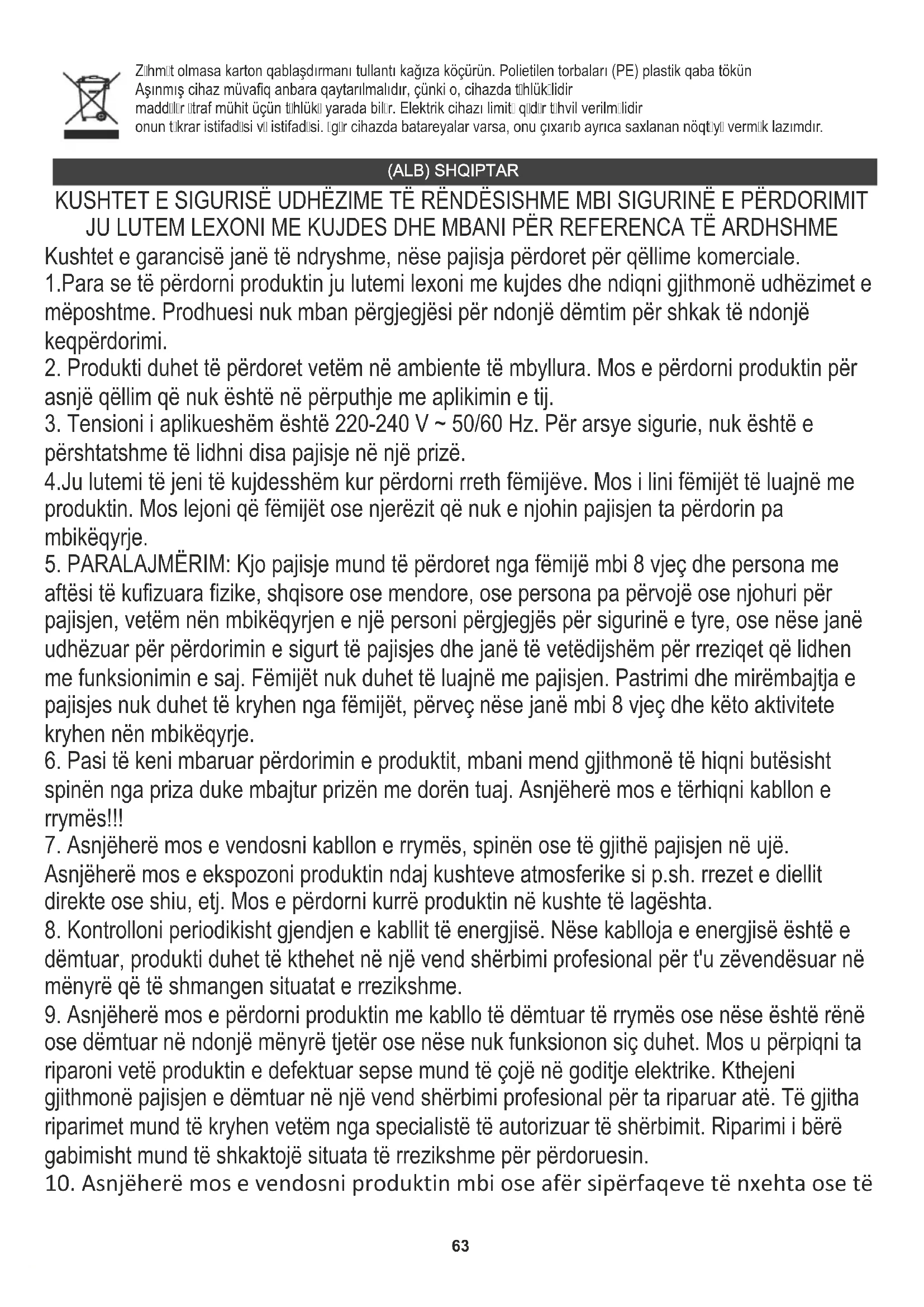 ose dëmtuar në ndonjë mënyrë tjetër ose nëse nuk funksionon siç duhet. Mos u përpiqni ta riparoni vetë produktin e defektuar sepse mund të çojë në goditje elektrike. Kthejeni gjithmonë pajisjen e dëmtuar në një vend shërbimi profesional për ta riparuar atë. Të gjitha riparimet mund të kryhen vetëm nga specialistë të autorizuar të shërbimit. Riparimi i bërë gabimisht mund të shkaktojë situata të rrezikshme për përdoruesin.