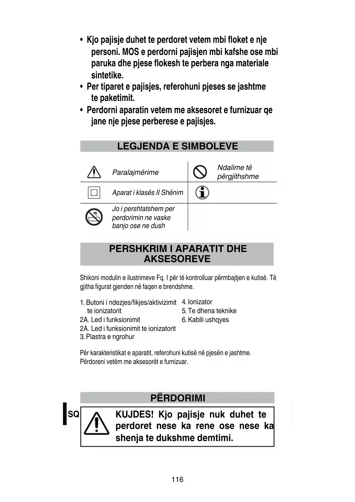Për karakteristikat e aparatit, referohuni kutisë në pjesën e jashtme. Përdoreni vetëm me aksesorët e furnizuar. PËRDORIMI KUJDES! Kjo pajisje nuk duhet te perdoret nese ka rene ose nese ka shenja te dukshme demtimi.117