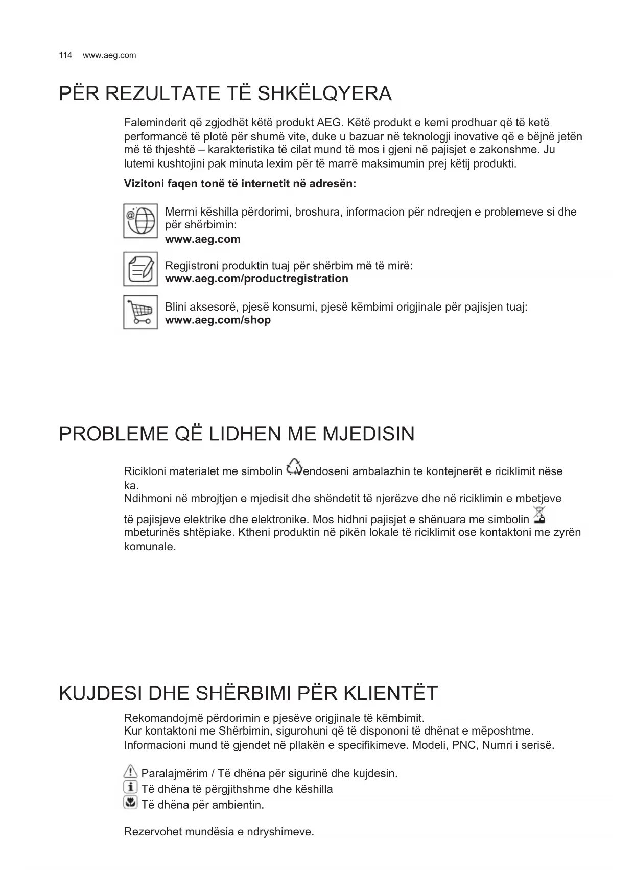 Faleminderit që zgjodhët këtë produkt AEG. Këtë produkt e kemi prodhuar që të ketë performancë të plotë për shumë vite, duke u bazuar në teknologji inovative që e bëjnë jetën më të thjeshtë – karakteristika të cilat mund të mos i gjeni në pajisjet e zakonshme. Ju lutemi kushtojini pak minuta lexim për të marrë maksimumin prej këtij produkti. Vizitoni faqen tonë të internetit në adresën: Merrni këshilla përdorimi, broshura, informacion për ndreqjen e problemeve si dhe për shërbimin: www.aeg.com Regjistroni produktin tuaj për shërbim më të mirë: www.aeg.com/productregistration Blini aksesorë, pjesë konsumi, pjesë këmbimi origjinale për pajisjen tuaj: www.aeg.com/shop