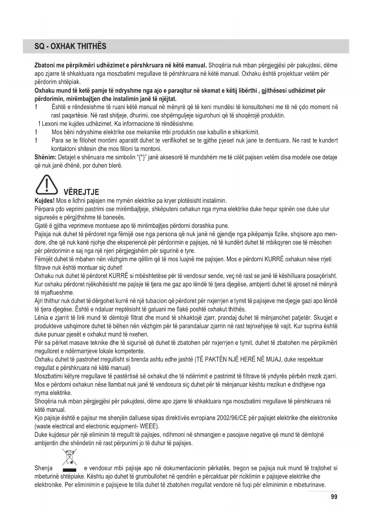 Zbatoni me përpikmëri udhëzimet e përshkruara në këtë manual. Shoqëria nuk mban përgjegjësi për pakujdesi, dëme apo zjarre të shkaktuara nga moszbatimi rregullave të përshkruara në këtë manual. Oxhaku është projektuar vetëm për përdorim shtëpiak. Oxhaku mund të ketë pamje të ndryshme nga ajo e paraqitur në skemat e këtij libërthi , gjithësesi udhëzimet për përdorimin, mirëmbajtjen dhe instalimin janë të njëjtat. ! Është e rëndesishme të ruani këtë manual në mënyrë që të keni mundësi të konsultoheni me të në çdo moment në rast paqartësie. Në rast shitjeje, dhurimi, ose shpërnguljeje sigurohuni që të shoqërojë produktin. ! Lexoni me kujdes udhëzimet. Ka informacione të rëndësishme. ! Mos bëni ndryshime elektrike ose mekanike mbi produktin ose kabullin e shkarkimit. ! Para se te llohet montimi aparatit duhet te verikohet se te gjithe pjeset nuk jane te demtuara. Ne rast te kundert kontaktoni shitesin dhe mos lloni ta montoni. Shënim: Detajet e shënuara me simbolin “{*}” janë aksesorë të mundshëm me të cilët pajisen vetëm disa modele ose detaje që nuk janë dhënë, por duhen blerë. VËREJTJE Kujdes! Mos e lidhni pajisjen me rrymën elektrike pa kryer plotësisht instalimin. Përpara çdo veprimi pastrimi ose mirëmbajtjeje, shkëputeni oxhakun nga rryma elektrike duke hequr spinën ose duke ulur siguresës e përgjithshme të banesës. Gjatë ë gjitha veprimeve montuese apo të mirëmbajtjes përdorni dorashka pune. Pajisja nuk duhet të përdoret nga fëmijë ose nga persona që nuk janë në gjendje nga pikëpamja zike, shqisore apo men- dore, dhe që nuk kanë njohje dhe eksperiencë për përdorimin e pajisjes, në të kundërt duhet të mbikqyren ose të mësohen për përdorimin e saj nga një njeri përgjegjshëm për sigurinë e tyre. Fëmijët duhet të mbahen nën vëzhgim me qëllim që të mos luajnë me pajisjen. Mos e përdorni KURRË oxhakun nëse rrjeti ltrave nuk është montuar siç duhet! Oxhaku nuk duhet të përdoret KURRË si mbështetëse për të vendosur sende, veç në rast se janë të këshilluara posaçërisht. Kur oxhaku përdoret njëkohësisht me pajisje të tjera me gaz apo lëndë të tjera djegëse, ambjenti duhet të ajroset në mënyrë të mjaftueshme. Ajri thithur nuk duhet të dërgohet kurrë në një tubacion që përdoret për nxjerrjen e tymit të pajisjeve me djegje gazi apo lëndë të tjera djegëse. Është e ndaluar rreptësisht të gatuani me akë poshtë oxhakut thithës. Lënia e zjarrit të lirë mund të dëmtojë ltrat dhe mund të shkaktojë zjarr, prandaj duhet të mënjanohet patjetër. Skuqjet e produkteve ushqimore duhet të bëhen nën vëzhgim për të parandaluar zjarrin në rast tejnxehjeje të vajit. Kur suprina është duke punuar pjesët e oxhakut mund të nxehen. Për sa përket masave teknike dhe të sigurisë që duhet të zbatohen për nxjerrjen e tymit, duhet të zbatohen me përpikmëri rregulloret e ndërmarrjeve lokale kompetente. Oxhaku duhet të pastrohet rregullisht si brenda ashtu edhe jashtë (TË PAKTËN NJË HERË NË MUAJ, duke respektuar rregullat e përshkruara në këtë manual) Moszbatimi këtyre rregullave të pastërtisë së oxhakut dhe të ndërrimit e pastrimit të ltrave të yndyrës përbën rrezik zjarri. Mos e përdorni oxhakun nëse llambat nuk janë të vendosura siç duhet për të mënjanuar kështu rrezikun e dridhjeve nga rryma elektrike. Shoqëria nuk mban përgjegjësi për pakujdesi, dëme apo zjarre të shkaktuara nga moszbatimi rregullave të përshkruara në këtë manual. Kjo pajisje është e pajisur me shenjën dalluese sipas direktivës evropiane 2002/96/CE për pajisjet elektrike dhe elektronike (waste electrical and electronic equipment- WEEE). Duke kujdesur për një eliminim të rregullt të pajisjes, ndihmoni në shmangjen e pasojave negative që mund të dëmtojnë ambjentin dhe shëndetin në rast përpunimi jo të duhur të pajisjes. S h e n j a e vendosur mbi pajisje apo në dokumentacionin përkatës, tregon se pajisja nuk mund të trajtohet si mbeturinë shtëpiake. Kështu ajo duhet të grumbullohet në qendrën e përcaktuar për riciklimin e pajisjeve elektrike dhe elektronike. Per eliminimin e pajisjeve te tilla duhet të zbatohen rregullat vendore në fuqi për eliminimin e mbeturinave.100 Për informacione më të hollësishme rreth trajtimit, grumbullimit dhe riciklimit të këtij produkti, ju lutem të lidheni me këshillin tuaj vendor, me shërbimin tuaj të eliminimit të mbeturinave shtëpiake ose me pikëshitjen ku keni blerë pajisjen. Aparat projektuar, testuar dhe prodhuar sipas: