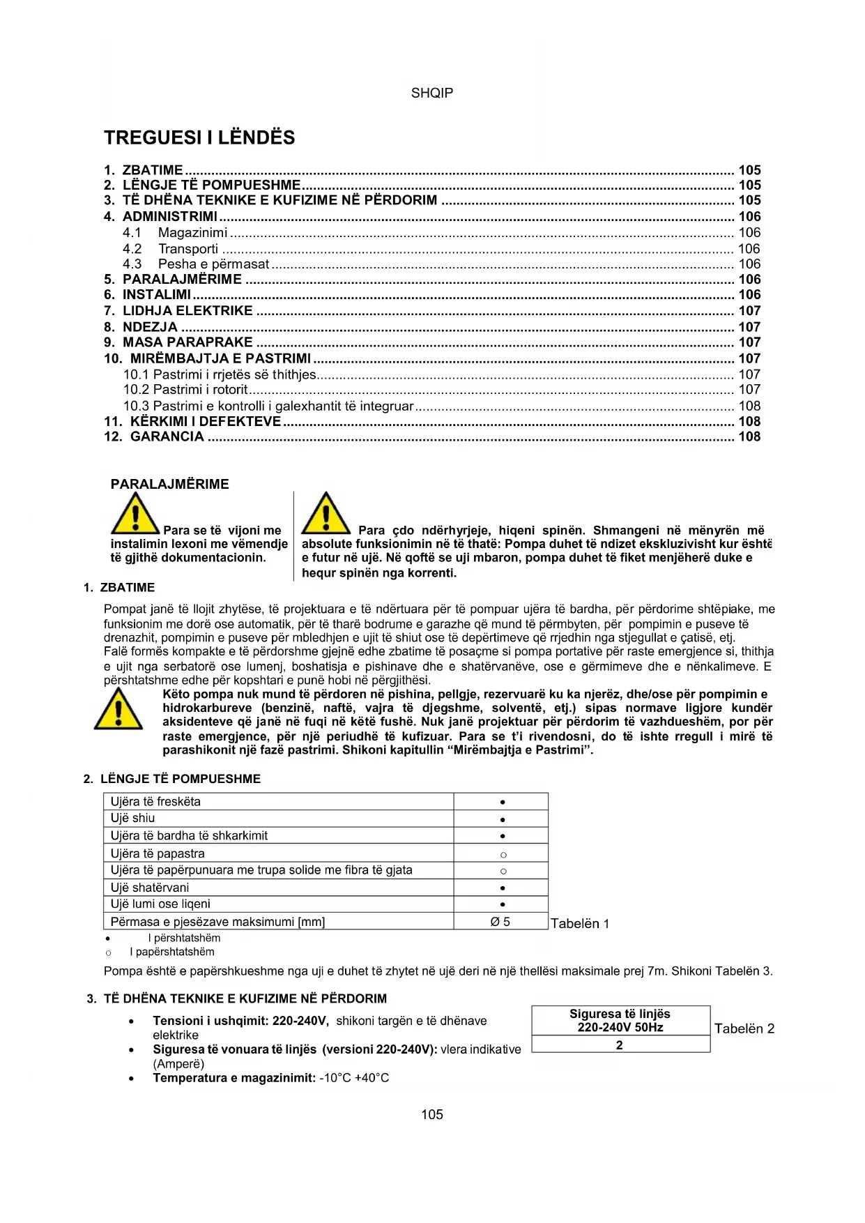 Pompa është e papërshkueshme nga uji e duhet të zhytet në ujë deri në një thellësi maksimale prej 7m. Shikoni Tabelën 3.