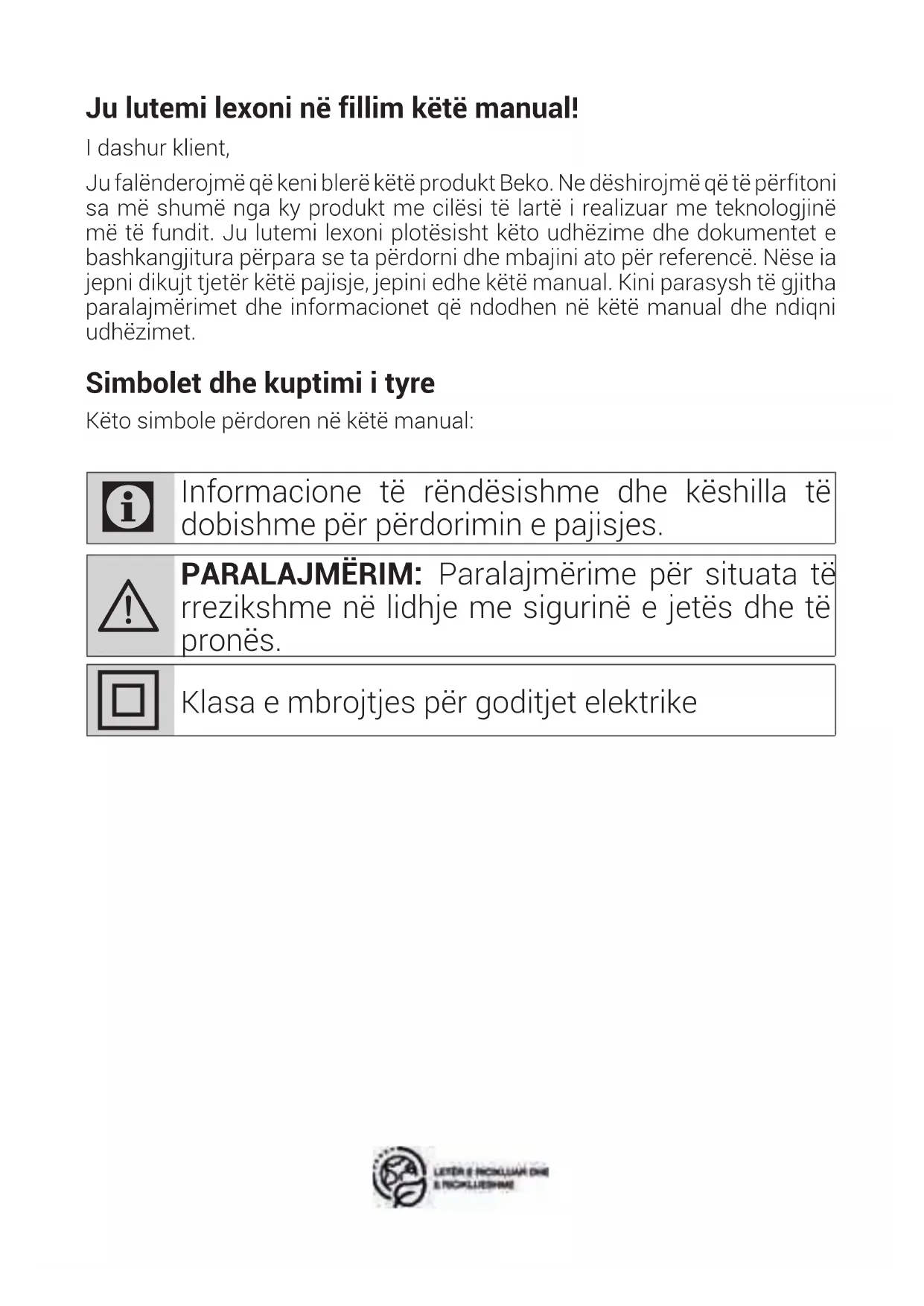 роверете о саот за праина откако е заври чистењетоJu lutemi lexoni në fillim këtë manual! I dashur klient, Ju falënderojmë që keni blerë këtë produkt Beko. Ne dëshirojmë që të përfitoni sa më shumë nga ky produkt me cilësi të lartë i realizuar me teknologjinë më të fundit. Ju lutemi lexoni plotësisht këto udhëzime dhe dokumentet e bashkangjitura përpara se ta përdorni dhe mbajini ato për referencë. Nëse ia jepni dikujt tjetër këtë pajisje, jepini edhe këtë manual. Kini parasysh të gjitha paralajmërimet dhe informacionet që ndodhen në këtë manual dhe ndiqni udhëzimet. Simbolet dhe kuptimi i tyre Këto simbole përdoren në këtë manual: