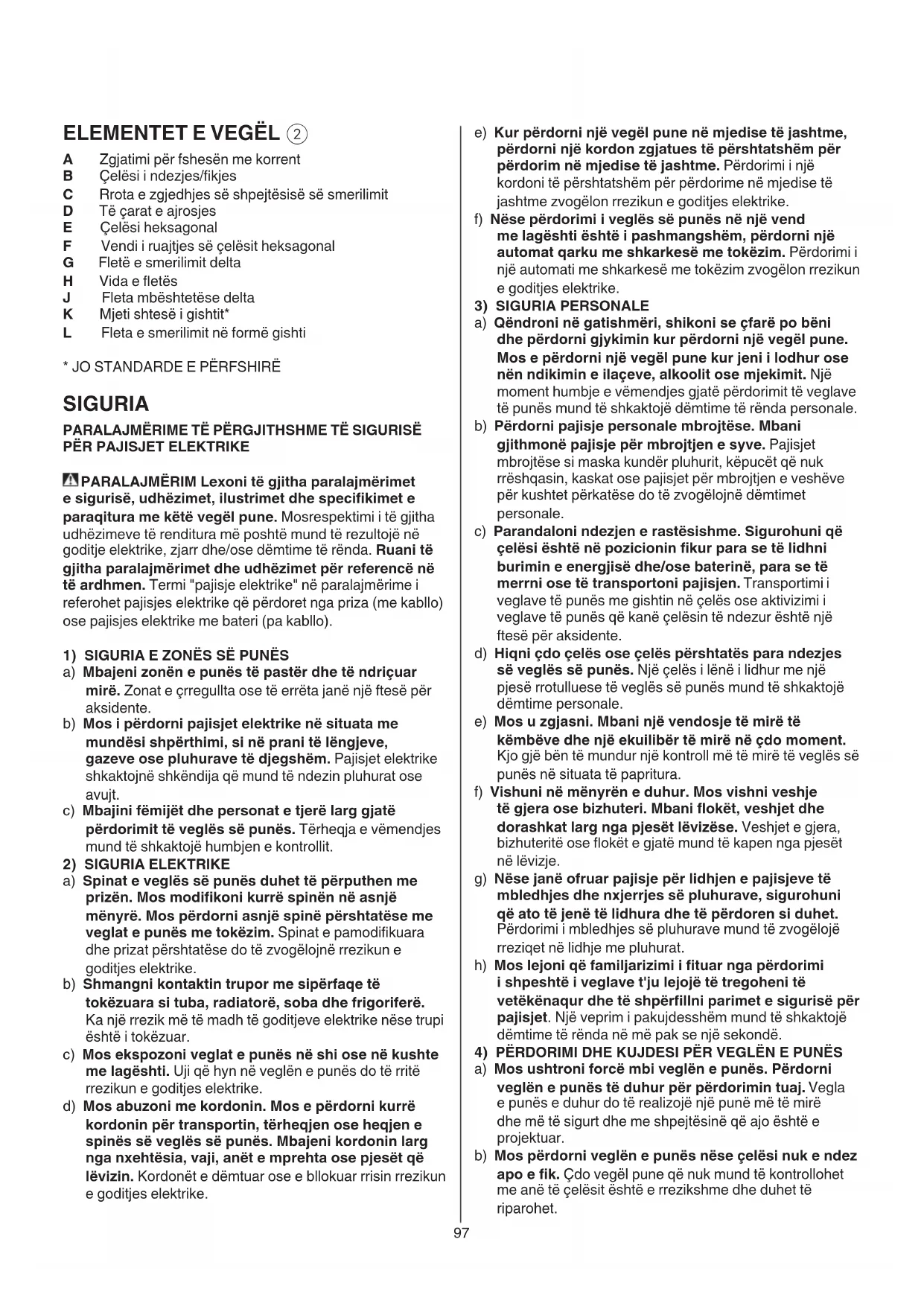 a) Qëndroni në gatishmëri, shikoni se çfarë po bëni dhe përdorni gjykimin kur përdorni një vegël pune. Mos e përdorni një vegël pune kur jeni i lodhur ose nën ndikimin e ilaçeve, alkoolit ose mjekimit. Një moment humbje e vëmendjes gjatë përdorimit të veglave të punës mund të shkaktojë dëmtime të rënda personale. b) Përdorni pajisje personale mbrojtëse. Mbani gjithmonë pajisje për mbrojtjen e syve. Pajisjet mbrojtëse si maska kundër pluhurit, këpucët që nuk rrëshqasin, kaskat ose pajisjet për mbrojtjen e veshëve për kushtet përkatëse do të zvogëlojnë dëmtimet personale. c) Parandaloni ndezjen e rastësishme. Sigurohuni që çelësi është në pozicionin kur para se të lidhni burimin e energjisë dhe/ose baterinë, para se të merrni ose të transportoni pajisjen. Transportimi i veglave të punës me gishtin në çelës ose aktivizimi i veglave të punës që kanë çelësin të ndezur është një ftesë për aksidente. d) Hiqni çdo çelës ose çelës përshtatës para ndezjes së veglës së punës. Një çelës i lënë i lidhur me një pjesë rrotulluese të veglës së punës mund të shkaktojë dëmtime personale. e) Mos u zgjasni. Mbani një vendosje të mirë të këmbëve dhe një ekuilibër të mirë në çdo moment. Kjo gjë bën të mundur një kontroll më të mirë të veglës së punës në situata të papritura. f) Vishuni në mënyrën e duhur. Mos vishni veshje të gjera ose bizhuteri. Mbani okët, veshjet dhe dorashkat larg nga pjesët lëvizëse. Veshjet e gjera, bizhuteritë ose okët e gjatë mund të kapen nga pjesët në lëvizje. g) Nëse janë ofruar pajisje për lidhjen e pajisjeve të mbledhjes dhe nxjerrjes së pluhurave, sigurohuni që ato të jenë të lidhura dhe të përdoren si duhet. Përdorimi i mbledhjes së pluhurave mund të zvogëlojë rreziqet në lidhje me pluhurat. h) Mos lejoni që familjarizimi i tuar nga përdorimi i shpeshtë i veglave t'ju lejojë të tregoheni të vetëkënaqur dhe të shpërllni parimet e sigurisë për pajisjet. Një veprim i pakujdesshëm mund të shkaktojë dëmtime të rënda në më pak se një sekondë.