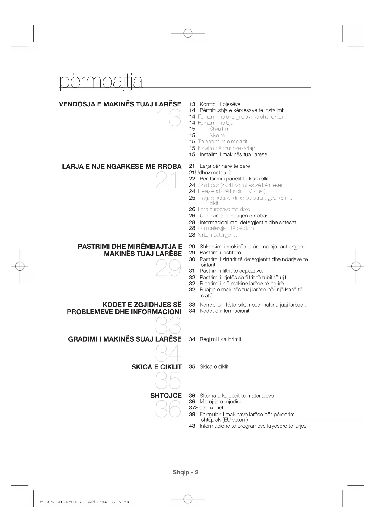 automatikisht. Makina larëse tani është gati për t’u përdorur. kodet e zgjidhjes së problemeve dhe informacioni WF1702NHWG-02796Q-03_SQ.indd 34 2014/11/27 15:07:12Shqip - 35