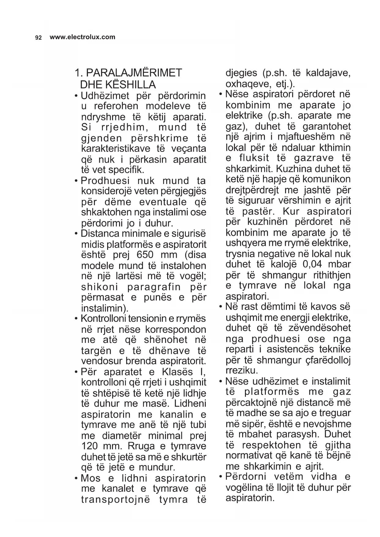- Nëse aspiratori përdoret në kombinim me aparate jo elektrike (p.sh. aparate me gaz), duhet të garantohet një ajrim i mjaftueshëm në lokal për të ndaluar kthimin e fluksit të gazrave të shkarkimit. Kuzhina duhet të ketë një hapje që komunikon drejtpërdrejt me jashtë për të siguruar vërshimin e ajrit të pastër. Kur aspiratori për kuzhinën përdoret në kombinim me aparate jo të ushqyera me rrymë elektrike, trysnia negative në lokal nuk duhet të kalojë 0,04 mbar për të shmangur rithithjen e tymrave në lokal nga aspiratori.
