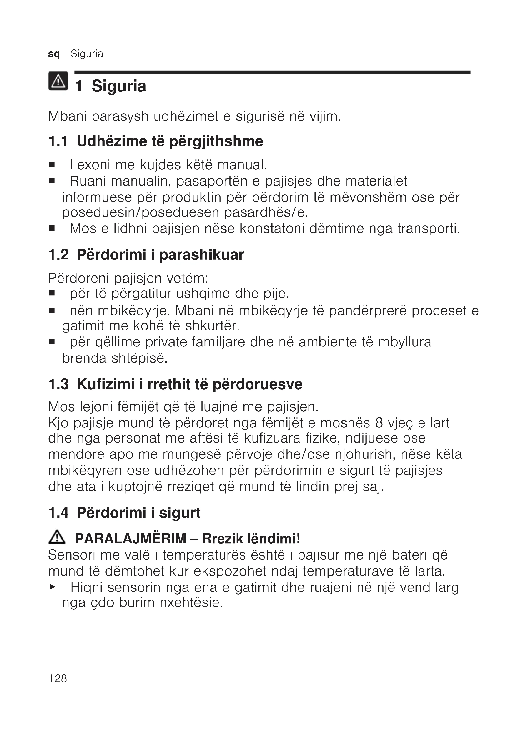 1 Siguria Mbani parasysh udhëzimet e sigurisë në vijim. 1.1 Udhëzime të përgjithshme ¡ Lexoni me kujdes këtë manual. ¡ Ruani manualin, pasaportën e pajisjes dhe materialet informuese për produktin për përdorim të mëvonshëm ose për poseduesin/poseduesen pasardhës/e. ¡ Mos e lidhni pajisjen nëse konstatoni dëmtime nga transporti. 1.2 Përdorimi i parashikuar Përdoreni pajisjen vetëm: ¡ për të përgatitur ushqime dhe pije. ¡ nën mbikëqyrje. Mbani në mbikëqyrje të pandërprerë proceset e gatimit me kohë të shkurtër. ¡ për qëllime private familjare dhe në ambiente të mbyllura brenda shtëpisë. 1.3 Kufizimi i rrethit të përdoruesve Mos lejoni fëmijët që të luajnë me pajisjen. Kjo pajisje mund të përdoret nga fëmijët e moshës 8 vjeç e lart dhe nga personat me aftësi të kufizuara fizike, ndijuese ose mendore apo me mungesë përvoje dhe/ose njohurish, nëse këta mbikëqyren ose udhëzohen për përdorimin e sigurt të pajisjes dhe ata i kuptojnë rreziqet që mund të lindin prej saj. 1.4 Përdorimi i sigurt PARALAJMËRIM‒Rrezik lëndimi! Sensori me valë i temperaturës është i pajisur me një bateri që mund të dëmtohet kur ekspozohet ndaj temperaturave të larta. ▶ Hiqni sensorin nga ena e gatimit dhe ruajeni në një vend larg nga çdo burim nxehtësie.Siguria sq