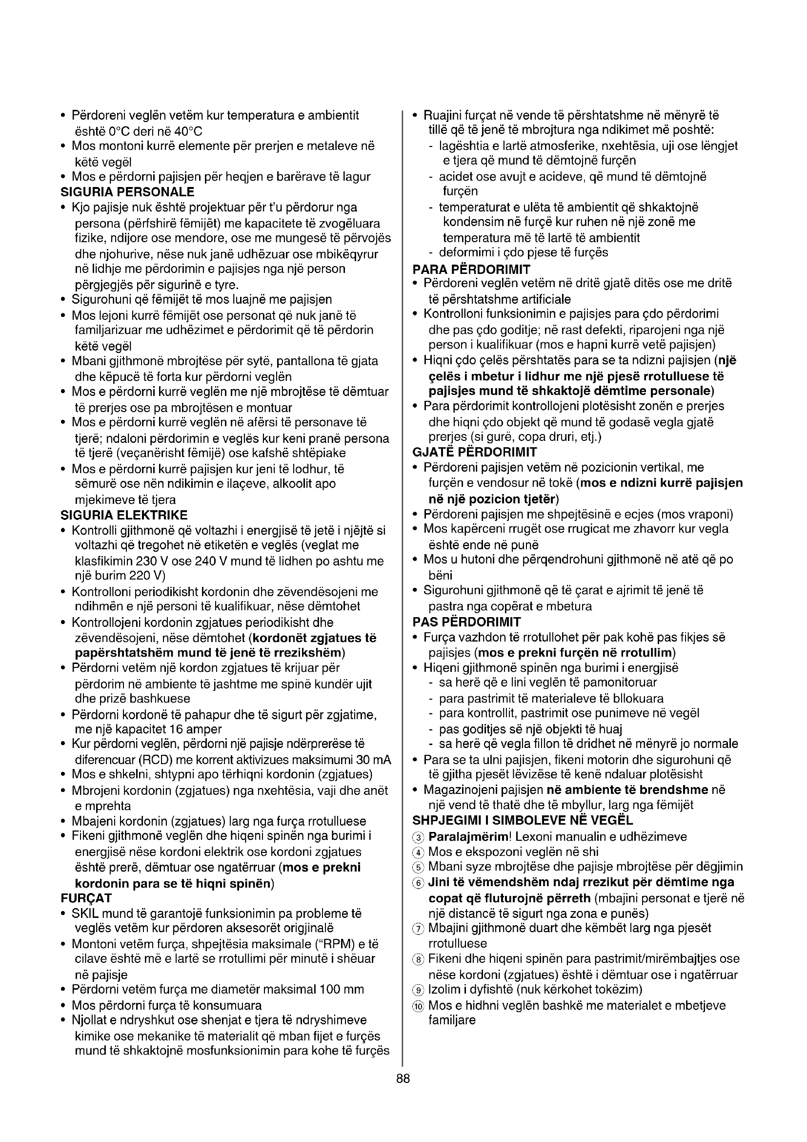3Paralajmërim! Lexoni manualin e udhëzimeve 4 Mos e ekspozoni veglën në shi 5 Mbani syze mbrojtëse dhe pajisje mbrojtëse për dëgjimin 6 Jinitëvëmendshëmndajrrezikutpërdëmtimenga copatqëfluturojnëpërreth (mbajini personat e tjerë në një distancë të sigurt nga zona e punës) 7 Mbajini gjithmonë duart dhe këmbët larg nga pjesët rrotulluese 8 Fikeni dhe hiqeni spinën para pastrimit/mirëmbajtjes ose nëse kordoni (zgjatues) është i dëmtuar ose i ngatërruar 9 Izolim i dyfishtë (nuk kërkohet tokëzim) 0 Mos e hidhni veglën bashkë me materialet e mbetjeve familjare89 PËRDORIMI
