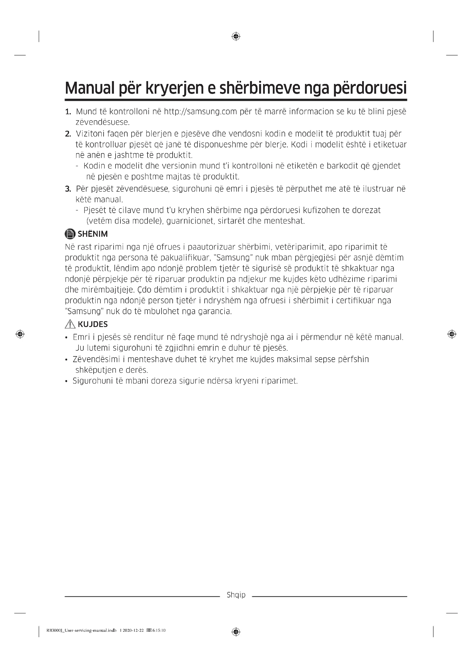 këtë manual. - Pjesët të cilave mund t'u kryhen shërbime nga përdoruesi kuzohen te dorezat (vetëm disa modele), guarnicionet, sirtarët dhe menteshat. SHËNIM Në rast riparimi nga një ofrues i paautorizuar shërbimi, vetëriparimit, apo riparimit të produktit nga persona të pakualikuar, "Samsung" nuk mban përgjegjësi për asnjë dëmtim të produktit, lëndim apo ndonjë problem tjetër të sigurisë së produktit të shkaktuar nga ndonjë përpjekje për të riparuar produktin pa ndjekur me kujdes këto udhëzime riparimi dhe mirëmbajtjeje. Çdo dëmtim i produktit i shkaktuar nga një përpjekje për të riparuar produktin nga ndonjë person tjetër i ndryshëm nga ofruesi i shërbimit i certikuar nga "Samsung" nuk do të mbulohet nga garancia. KUJDES