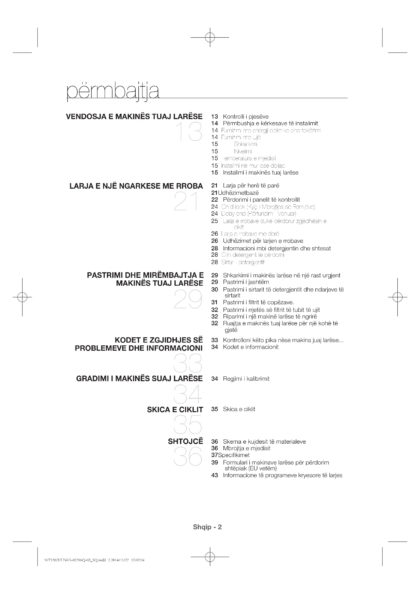 automatikisht. Makina larëse tani është gati për t’u përdorur. kodet e zgjidhjes së problemeve dhe informacioni WF1702NHWG-02796Q-03_SQ.indd 34 2014/11/27 15:07:12Shqip - 35