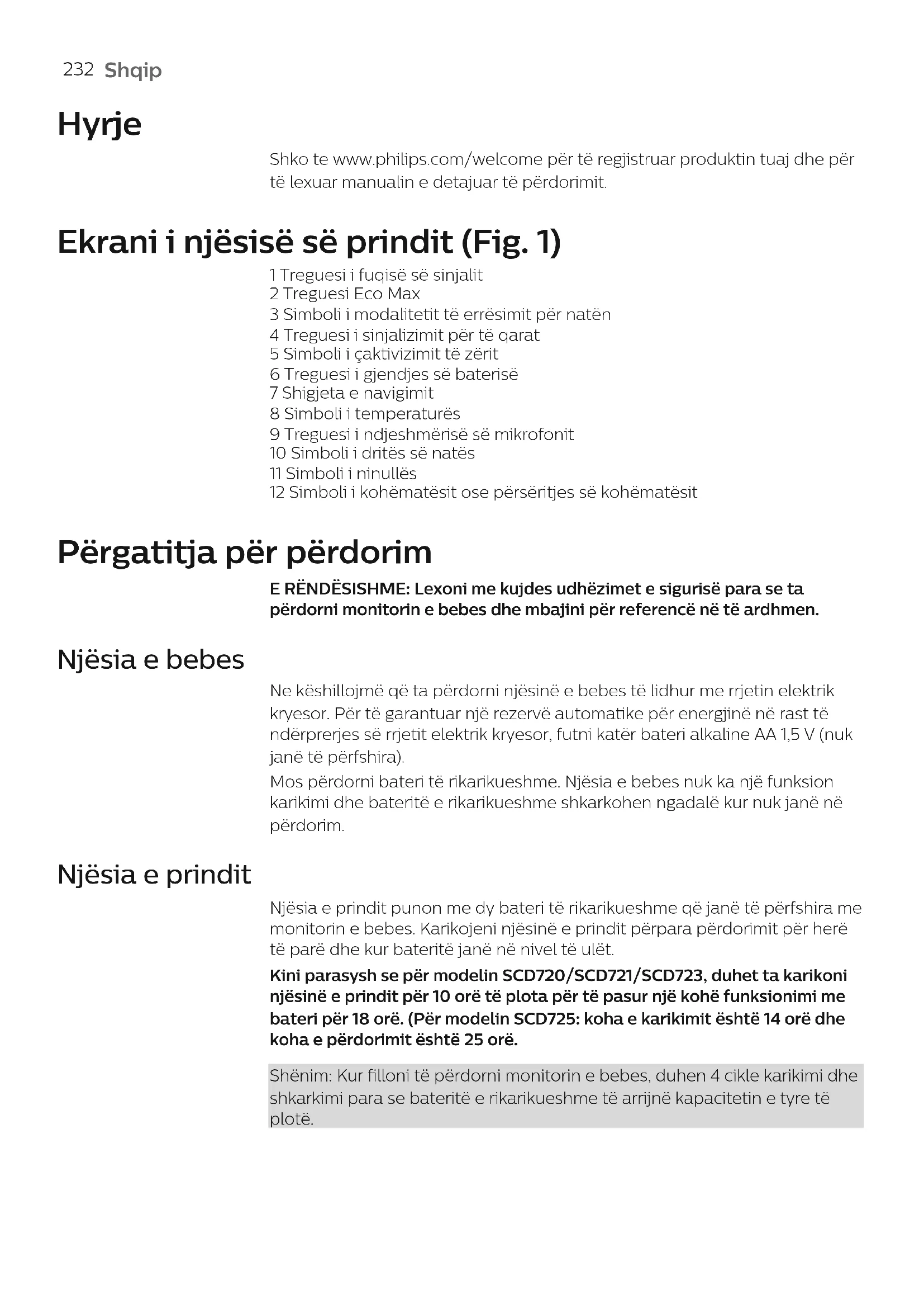 Kini parasysh se per modelin SCD720/SCD721/SCD723, duhet ta karikoni njesine e prindit per 10 ore te plota per tepasur nje kohé funkionsimi me bateri per 18 ore. (Per modelin SCD725: koha e karikimit eshte 14 ore dhe koha e perdorimit eshte 25 ore.