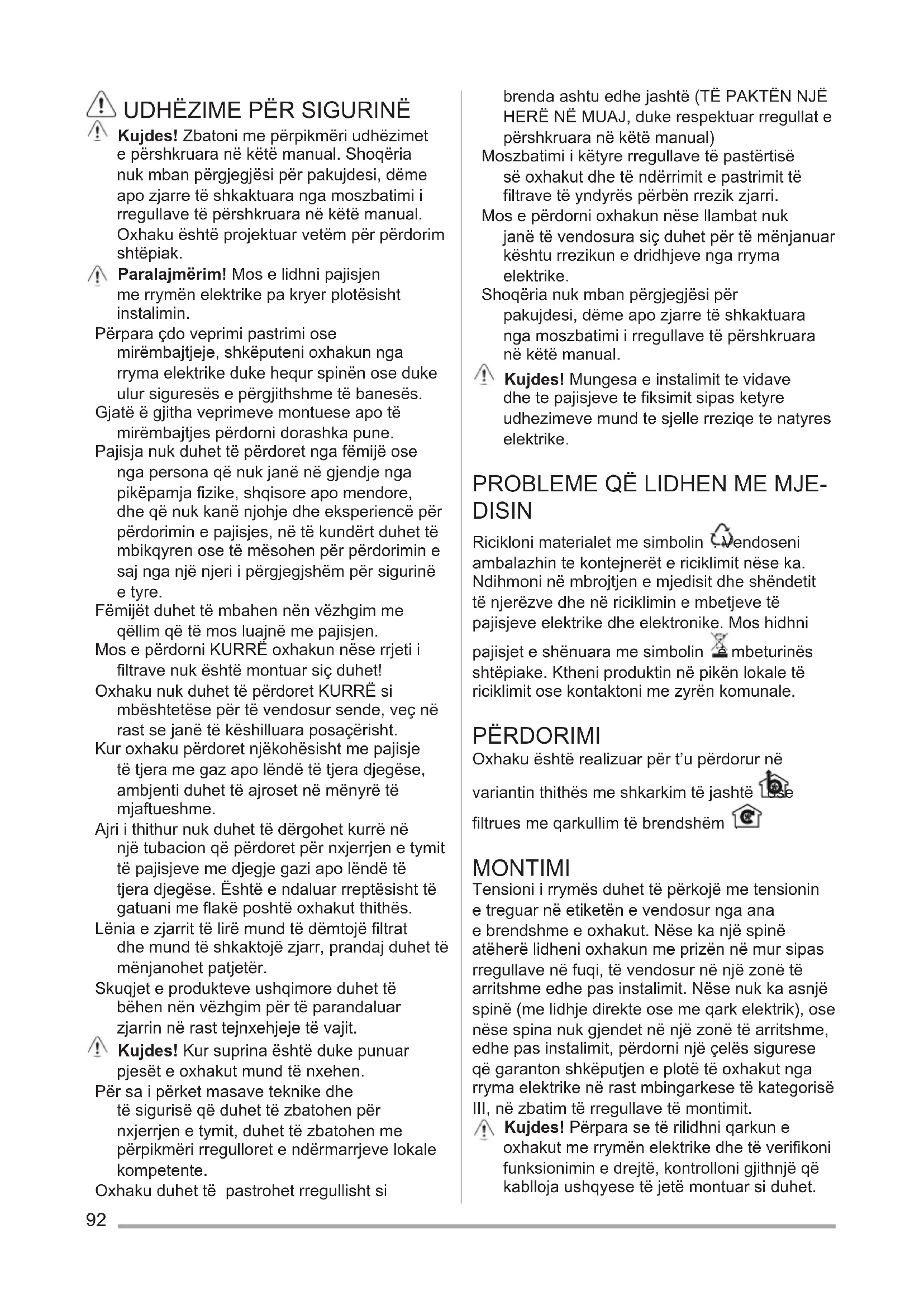 Kujdes! Zbatoni me përpikmëri udhëzimet e përshkruara në këtë manual. Shoqëria nuk mban përgjegjësi për pakujdesi, dëme apo zjarre të shkaktuara nga moszbatimi i rregullave të përshkruara në këtë manual. Oxhaku është projektuar vetëm për përdorim shtëpiak. Paralajmërim! Mos e lidhni pajisjen me rrymën elektrike pa kryer plotësisht instalimin. Përpara çdo veprimi pastrimi ose mirëmbajtjeje, shkëputeni oxhakun nga rryma elektrike duke hequr spinën ose duke ulur siguresës e përgjithshme të banesës. Gjatë ë gjitha veprimeve montuese apo të mirëmbajtjes përdorni dorashka pune. Pajisja nuk duhet të përdoret nga fëmijë ose nga persona që nuk janë në gjendje nga pikëpamja fizike, shqisore apo mendore, dhe që nuk kanë njohje dhe eksperiencë për përdorimin e pajisjes, në të kundërt duhet të mbikqyren ose të mësohen për përdorimin e saj nga një njeri i përgjegjshëm për sigurinë e tyre. Fëmijët duhet të mbahen nën vëzhgim me qëllim që të mos luajnë me pajisjen. Mos e përdorni KURRË oxhakun nëse rrjeti i filtrave nuk është montuar siç duhet! Oxhaku nuk duhet të përdoret KURRË si mbështetëse për të vendosur sende, veç në rast se janë të këshilluara posaçërisht. Kur oxhaku përdoret njëkohësisht me pajisje të tjera me gaz apo lëndë të tjera djegëse, ambjenti duhet të ajroset në mënyrë të mjaftueshme. Ajri i thithur nuk duhet të dërgohet kurrë në një tubacion që përdoret për nxjerrjen e tymit të pajisjeve me djegje gazi apo lëndë të tjera djegëse. Është e ndaluar rreptësisht të gatuani me flakë poshtë oxhakut thithës. Lënia e zjarrit të lirë mund të dëmtojë filtrat dhe mund të shkaktojë zjarr, prandaj duhet të mënjanohet patjetër. Skuqjet e produkteve ushqimore duhet të bëhen nën vëzhgim për të parandaluar zjarrin në rast tejnxehjeje të vajit. Kujdes! Kur suprina është duke punuar pjesët e oxhakut mund të nxehen. Për sa i përket masave teknike dhe të sigurisë që duhet të zbatohen për nxjerrjen e tymit, duhet të zbatohen me përpikmëri rregulloret e ndërmarrjeve lokale kompetente. Oxhaku duhet të pastrohet rregullisht si brenda ashtu edhe jashtë (TË PAKTËN NJË HERË NË MUAJ, duke respektuar rregullat e përshkruara në këtë manual) Moszbatimi i këtyre rregullave të pastërtisë së oxhakut dhe të ndërrimit e pastrimit të filtrave të yndyrës përbën rrezik zjarri. Mos e përdorni oxhakun nëse llambat nuk janë të vendosura siç duhet për të mënjanuar kështu rrezikun e dridhjeve nga rryma elektrike. Shoqëria nuk mban përgjegjësi për pakujdesi, dëme apo zjarre të shkaktuara nga moszbatimi i rregullave të përshkruara në këtë manual. Kujdes! Mungesa e instalimit te vidave dhe te pajisjeve te fiksimit sipas ketyre udhezimeve mund te sjelle rreziqe te natyres elektrike.