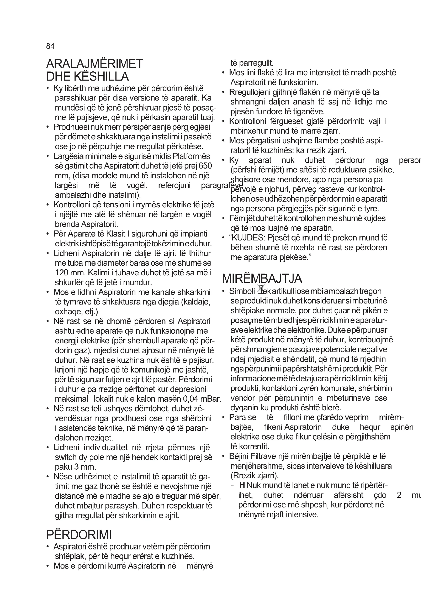 - Bëjini Filtrave një mirëmbajtje të përpiktë e të menjëhershme,sipasintervalevetëkëshilluara (Rrezik zjarri). - H Nuk mund të lahet e nuk mund të ripërtër- ihet, duhet ndërruar afërsisht çdo 2 muaj përdorimiosemëshpesh,kurpërdoretnë mënyrëmjaftintensive.85