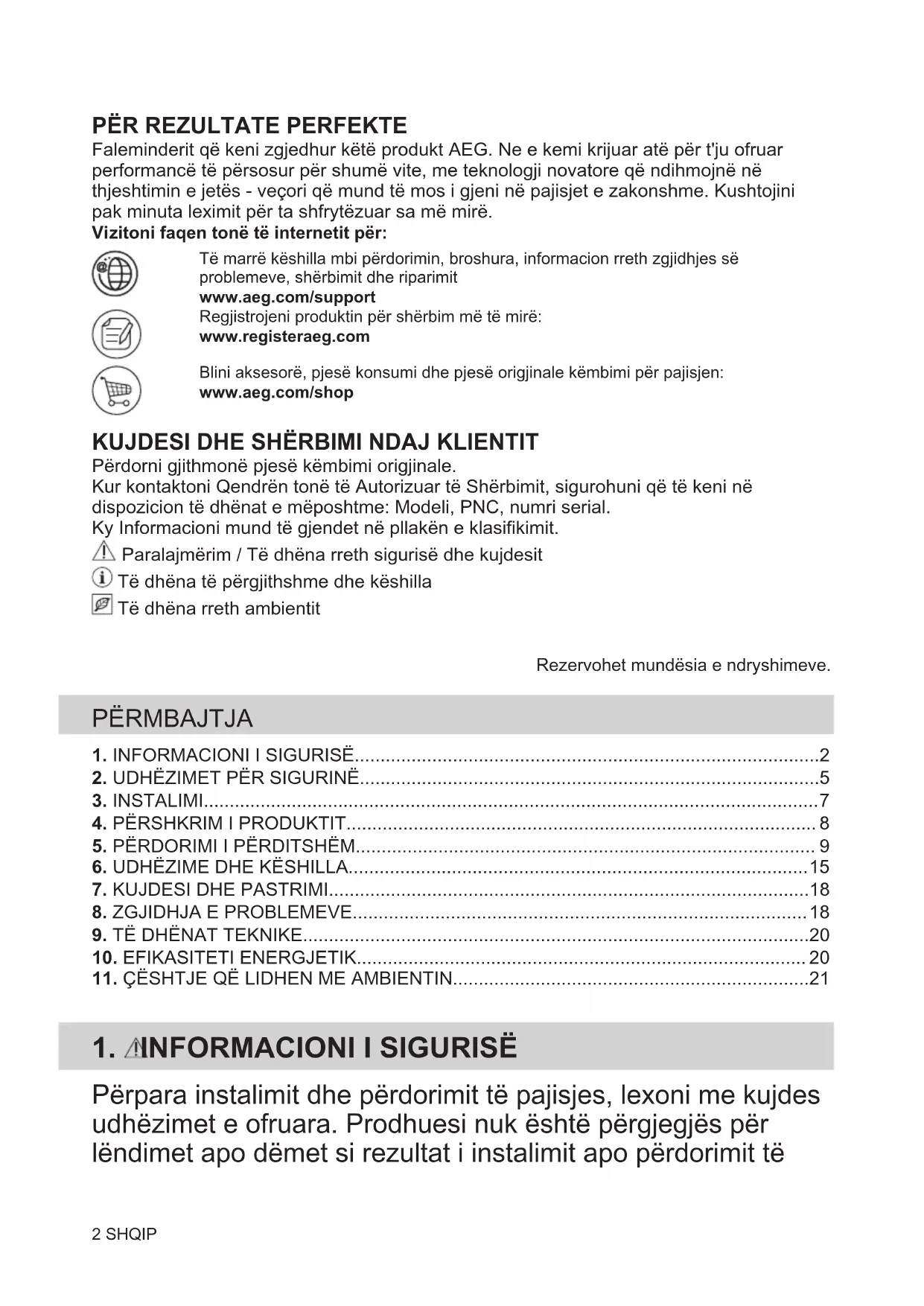Faleminderit që keni zgjedhur këtë produkt AEG. Ne e kemi krijuar atë për t'ju ofruar performancë të përsosur për shumë vite, me teknologji novatore që ndihmojnë në thjeshtimin e jetës - veçori që mund të mos i gjeni në pajisjet e zakonshme. Kushtojini pak minuta leximit për ta shfrytëzuar sa më mirë. Vizitoni faqen tonë të internetit për:Të marrë këshilla mbi përdorimin, broshura, informacion rreth zgjidhjes sëproblemeve, shërbimit dhe riparimitwww.aeg.com/supportRegjistrojeni produktin për shërbim më të mirë:www.registeraeg.comBlini aksesorë, pjesë konsumi dhe pjesë origjinale këmbimi për pajisjen:www.aeg.com/shop