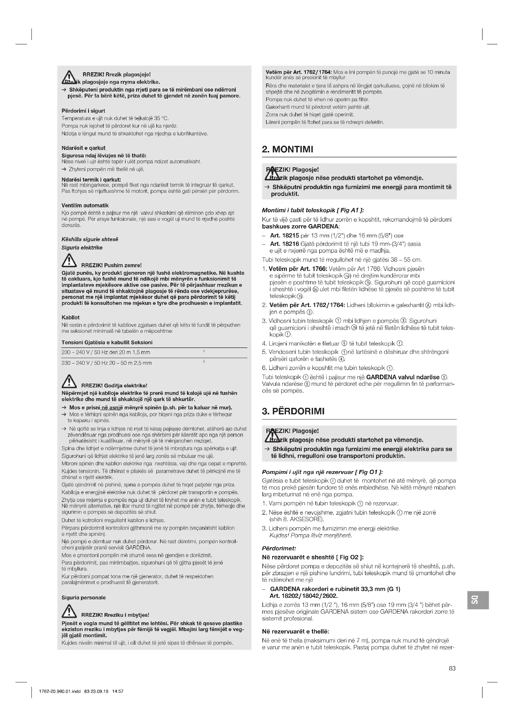 Kujdes! Pompa lëviz menjëherë. Përdorimet: Në rezervuarët e sheshtë [ Fig O2 ]: Nëse përdoret pompa e depozitës së shiut në kontejnerë të sheshtë, p.sh. për zbrazjen e një pishine lundrimi, tubi teleskopik mund të çmontohet dhe të ndërrohet me një – GARDENA rakorderi e rubinetit 33,3 mm (G 1) Art. 18202 / 18042 / 2602. Lidhja e zorrës 13 mm (1/2 "), 16 mm (5/8") ose 19 mm (3/4 ") bëhet për- mes pjesëve origjinale GARDENA sistem ose GARDENA rakorderi zorre të sistemit profesional. Në rezervuarët e thellë: Në enë të thella (maksimumi deri në 7 m), pompa nuk mund të qëndrojë e varur me anën e tubit teleskopik. Pastaj pompa duhet të zhytet në rezer- RREZIK! Rrezik plagosjeje! Rrezik plagosjeje nga rryma elektrike. v Shkëputeni produktin nga rrjeti para se të mirëmbani ose ndërroni pjesë. Për ta bërë këtë, priza duhet të gjendet në zonën tuaj pamore. Përdorimi i sigurt Temperatura e ujit nuk duhet të tejkalojë 35 °C. Pompa nuk lejohet të përdoret kur në ujë ka njerëz. Ndotja e lëngut mund të shkaktohet nga rrjedhja e lubrifikantëve. Ndarësit e qarkut Siguresa ndaj lëvizjes në të thatë: Nëse niveli i ujit është tepër i ulët pompa ndizet automatikisht. v Zhyteni pompën më thellë në ujë. Ndarësi termik i qarkut: Në rast mbingarkese, pompë fiket nga ndarësit termik të integruar të qarkut. Pas ftohjes së mjaftueshme të motorit, pompa është gati përsëri për përdorim. Ventilim automatik Kjo pompë është e pajisur me një valvul shkarkimi që eliminon çdo xhep ajri në pompë. Për arsye funksionale, një sasi e vogël uji mund të rrjedhë poshtë dorezës. Këshilla sigurie shtesë Siguria elektrike RREZIK! Pushim zemre! Gjatë punës, ky produkt gjeneron një fushë elektromagnetike. Në kushte të caktuara, kjo fushë mund të ndikojë mbi mënyrën e funksionimit të implantateve mjekësore aktive ose pasive. Për të përjashtuar rrezikun e situatave që mund të shkaktojnë plagosje të rënda ose vdekjeprurëse, personat me një implantat mjekësor duhet që para përdorimit të këtij produkti të konsultohen me mjekun e tyre dhe prodhuesin e implantatit. Kabllot Në rastin e përdorimit të kabllove zgjatues duhet që këto të fundit të përputhen me seksionet minimalë në tabelën e mëposhtme: Tensioni Gjatësia e kabullit Seksioni 230 – 240 V / 50 Hz deri 20 m 1,5 mm