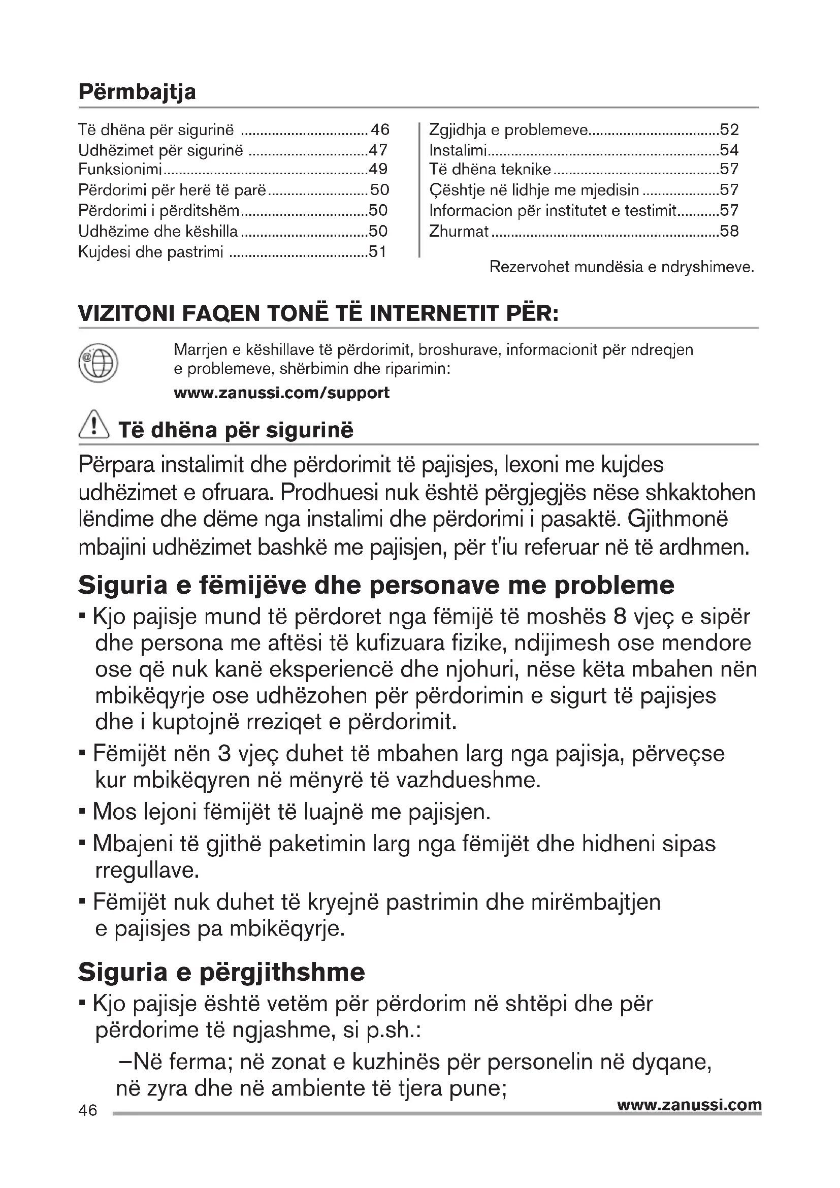 - Kjo pajisje është vetëm për përdorim në shtëpi dhe për përdorime të ngjashme, si p.sh.: –Në ferma; në zonat e kuzhinës për personelin në dyqane, nëzyra dhe në ambiente të tjera pune; Të dhëna për sigurinë ................................. 46 Udhëzimet për sigurinë ...............................47 Funksionimi .....................................................49 Përdorimi për herë të parë .......................... 50 Përdorimi i përditshëm .................................50 Udhëzime dhe këshilla .................................50 Kujdesi dhe pastrimi ....................................51 Zgjidhja e problemeve..................................52 Instalimi ............................................................54 Të dhëna teknike ...........................................57 Çështje në lidhje me mjedisin ....................57 Informacion për institutet e testimit ...........57 Zhurmat ...........................................................5847 www.zanussi.com –Nga klientët në hotele, motele, ambiente me fjetje dhe mëngjes dhe ambiente të tjera banimi.