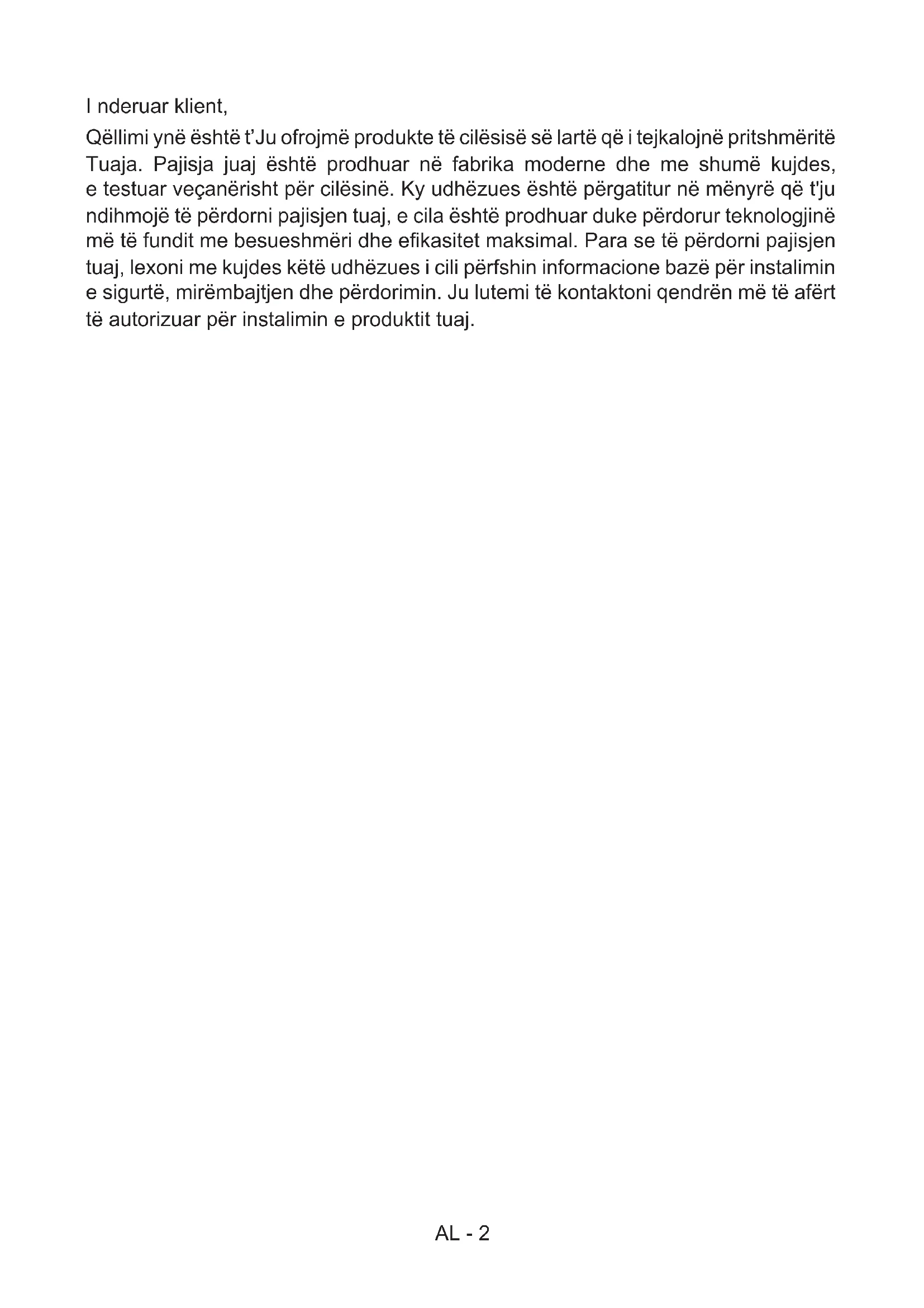 - Pajisja duhet të instalohet nga një tek- nik i autorizuar dhe të vihet në përdorim. Prodhuesi nuk është përgjegjës për çdo dëm që mund të shkaktohet nga vendosja e gabuar dhe instalimi nga persona të paautorizuar.