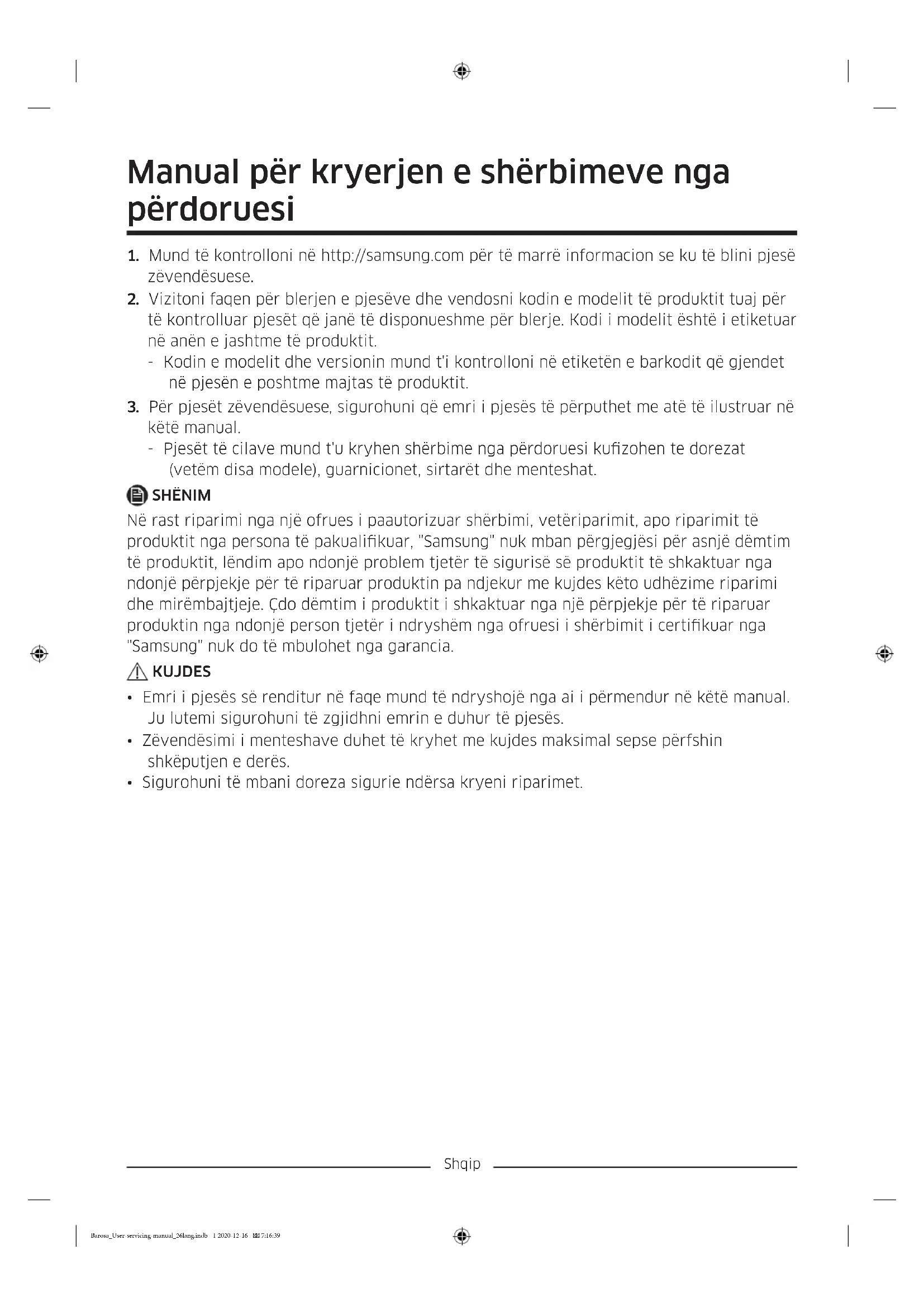 këtë manual. - Pjesët të cilave mund t'u kryhen shërbime nga përdoruesi kuzohen te dorezat (vetëm disa modele), guarnicionet, sirtarët dhe menteshat. SHËNIM Në rast riparimi nga një ofrues i paautorizuar shërbimi, vetëriparimit, apo riparimit të produktit nga persona të pakualikuar, "Samsung" nuk mban përgjegjësi për asnjë dëmtim të produktit, lëndim apo ndonjë problem tjetër të sigurisë së produktit të shkaktuar nga ndonjë përpjekje për të riparuar produktin pa ndjekur me kujdes këto udhëzime riparimi dhe mirëmbajtjeje. Çdo dëmtim i produktit i shkaktuar nga një përpjekje për të riparuar produktin nga ndonjë person tjetër i ndryshëm nga ofruesi i shërbimit i certikuar nga "Samsung" nuk do të mbulohet nga garancia. KUJDES