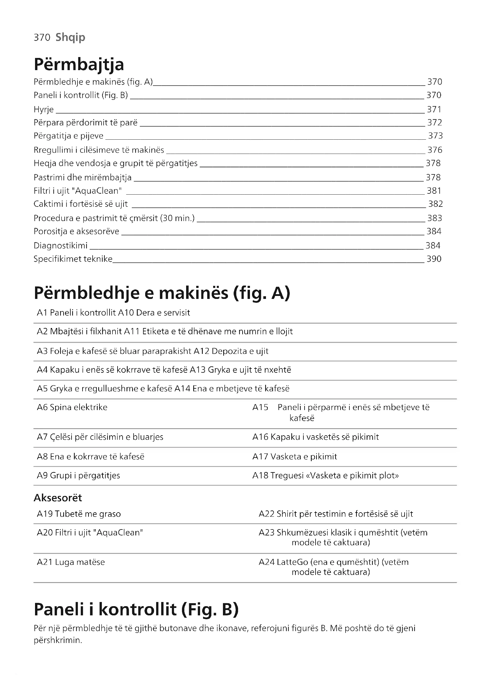 Shqip Përmbajtja Përmbledhje e makinës (fig. A)______________________________________________________________ 370 Paneli i kontrollit (Fig. B) ___________________________________________________________________ 370 Hyrje ____________________________________________________________________________________ 371 Përpara përdorimit të parë _________________________________________________________________ 372 Përgatitja e pijeve _________________________________________________________________________ 373 Rregullimi i cilësimeve të makinës ___________________________________________________________ 376 Heqja dhe vendosja e grupit të përgatitjes ___________________________________________________ 378 Pastrimi dhe mirëmbajtja __________________________________________________________________ 378 Filtri i ujit "AquaClean" ____________________________________________________________________ 381 Caktimi i fortësisë së ujit ___________________________________________________________________ 382 Procedura e pastrimit të çmërsit (30 min.) ____________________________________________________ 383 Porositja e aksesorëve _____________________________________________________________________ 384 Diagnostikimi ____________________________________________________________________________ 384 Specifikimet teknike_______________________________________________________________________ 390 Përmbledhje e makinës (fig. A) A1 Paneli i kontrollit A10 Dera e servisit A2 Mbajtësi i filxhanit A11 Etiketa e të dhënave me numrin e llojit A3 Foleja e kafesë së bluar paraprakisht A12 Depozita e ujit A4 Kapaku i enës së kokrrave të kafesë A13 Gryka e ujit të nxehtë A5 Gryka e rregullueshme e kafesë A14 Ena e mbetjeve të kafesë A6 Spina elektrike A15 Paneli i përparmë i enës së mbetjeve të kafesë A7 Çelësi për cilësimin e bluarjes A16 Kapaku i vasketës së pikimit A8 Ena e kokrrave të kafesë A17 Vasketa e pikimit A9 Grupi i përgatitjes A18 Treguesi «Vasketa e pikimit plot» Aksesorët A19 Tubetë me graso A22 Shirit për testimin e fortësisë së ujit A20 Filtri i ujit "AquaClean" A23 Shkumëzuesi klasik i qumështit (vetëm modele të caktuara) A21 Luga matëse A24 LatteGo (ena e qumështit) (vetëm modele të caktuara) Paneli i kontrollit (Fig. B) Për një përmbledhje të të gjithë butonave dhe ikonave, referojuni figurës B. Më poshtë do të gjeni përshkrimin.371 Shqip Shqip Disa nga butonat/ikonat janë vetëm për modele të caktuara. B1 Butoni i ndezjes/fikjes B7 Ikonat paralajmëruese B2 Ikonat e pijeve* B8 Drita e ndezjes B3 Ikona e fortësisë së aromës/kafesë së bluar paraprakisht. B9 Butoni i ndezjes/fikjes B4 Ikona e sasisë së pijes B10 Ikona «Calc / Clean» (Pastrimi i Çmërsit) B5 Ikona e sasisë së qumështit (vetëm modele të caktuara) B11 Ikona «AquaClean» B6 Ikona e temperaturës së kafes (vetëm modele të caktuara)