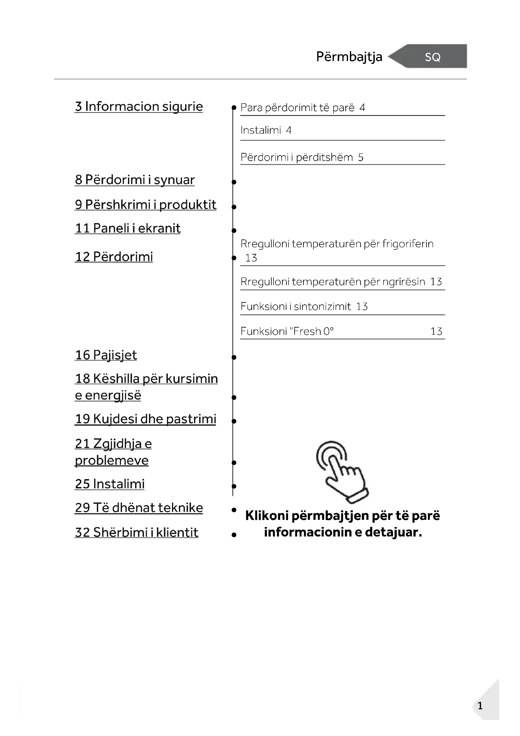 Ekrani i temperaturës së frigoriferit Para përdorimit të parë ► Hiqni të gjitha materialet e paketimit, mbajini larg fëmijëve dhe hidhini në një mënyrë ekologjike. ► Pastroni pjesën e brendshme dhe të jashtme të pajisjes, si dhe pjesën e brendshme dhe aksesorët me ujë dhe një detergjent të butë dhe thajeni mirë me leckë të butë. ► Pasi pajisja të jetë niveluar dhe pastruar, prisni të paktën 2 orë përpara se ta lidhni me furnizimin me korrent. Shih seksionin "INSTALIMI". ► Ftohini paraprakisht ndarjet në cilësime të larta përpara se t'i ngarkoni me ushqim.SQ Përdorimi PËRMBAJTJA