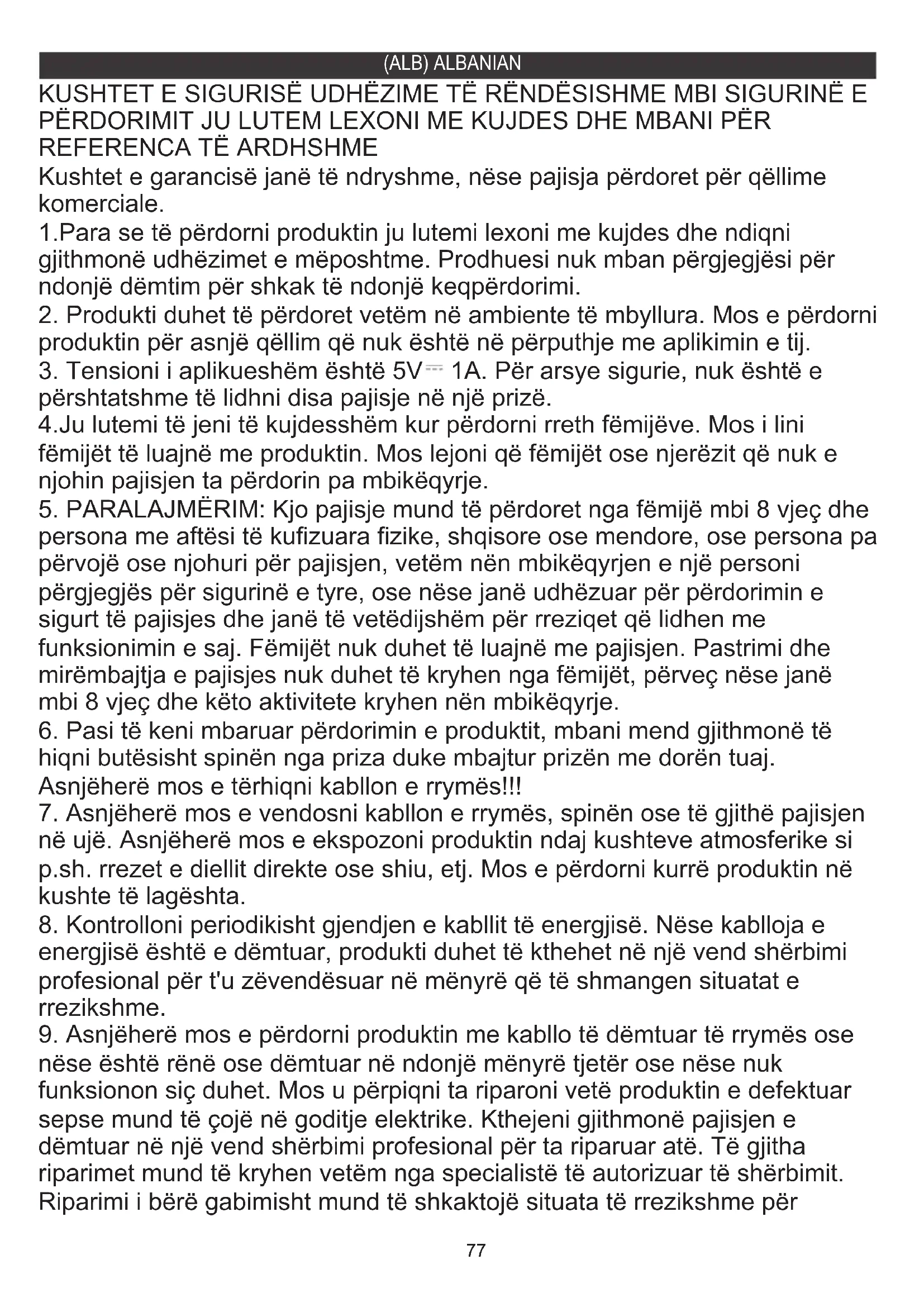 Kushtet e garancisë janë të ndryshme, nëse pajisja përdoret për qëllime komerciale. 1.Para se të përdorni produktin ju lutemi lexoni me kujdes dhe ndiqni gjithmonë udhëzimet e mëposhtme. Prodhuesi nuk mban përgjegjësi për ndonjë dëmtim për shkak të ndonjë keqpërdorimi.