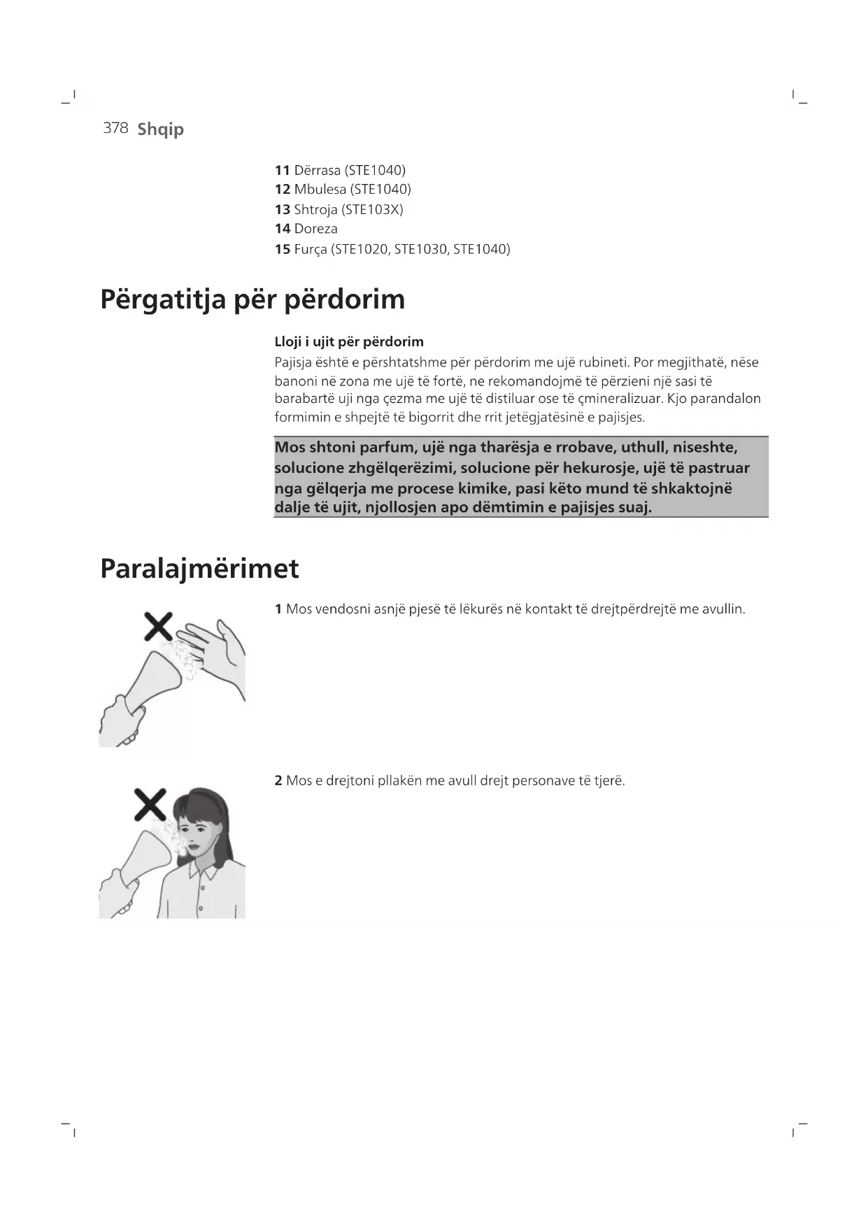 1 Koka avulluese 2 Zorra e avullit 3 Platforma e avulluesit 4 Varësja (STE1011, STE1020, STE1030, STE1040) 5 Kapësja e fiksimit të shufrës 6 Këmba 7 Disku i avullit 8 Bazamenti 9 Çelësi i pastrimit të çmërsit 10 Depozita e ujit378 Shqip 11 Dërrasa (STE1040) 12 Mbulesa (STE1040) 13 Shtroja (STE103X) 14 Doreza 15 Furça (STE1020, STE1030, STE1040) Përgatitja për përdorim Lloji i ujit për përdorim Pajisja është e përshtatshme për përdorim me ujë rubineti. Por megjithatë, nëse banoni në zona me ujë të fortë, ne rekomandojmë të përzieni një sasi të barabartë uji nga çezma me ujë të distiluar ose të çmineralizuar. Kjo parandalon formimin e shpejtë të bigorrit dhe rrit jetëgjatësinë e pajisjes. Mos shtoni parfum, ujë nga tharësja e rrobave, uthull, niseshte, solucione zhgëlqerëzimi, solucione për hekurosje, ujë të pastruar nga gëlqerja me procese kimike, pasi këto mund të shkaktojnë dalje të ujit, njollosjen apo dëmtimin e pajisjes suaj. Paralajmërimet 1 Mos vendosni asnjë pjesë të lëkurës në kontakt të drejtpërdrejtë me avullin. 2 Mos e drejtoni pllakën me avull drejt personave të tjerë.379 Shqip 3 Mos e mbani veshjen në një mënyrë që është në kontakt të drejtpërdrejtë me avullin. 4 Mos e përdorni kokën e avulluesit në drejtim poshtë. 5 Mos e përkulni zorrën për të avulluar rrobat. > 5 min. 6 Mos e lini avulluesin pa mbikëqyrje për më shumë se 5 minuta.380 Shqip