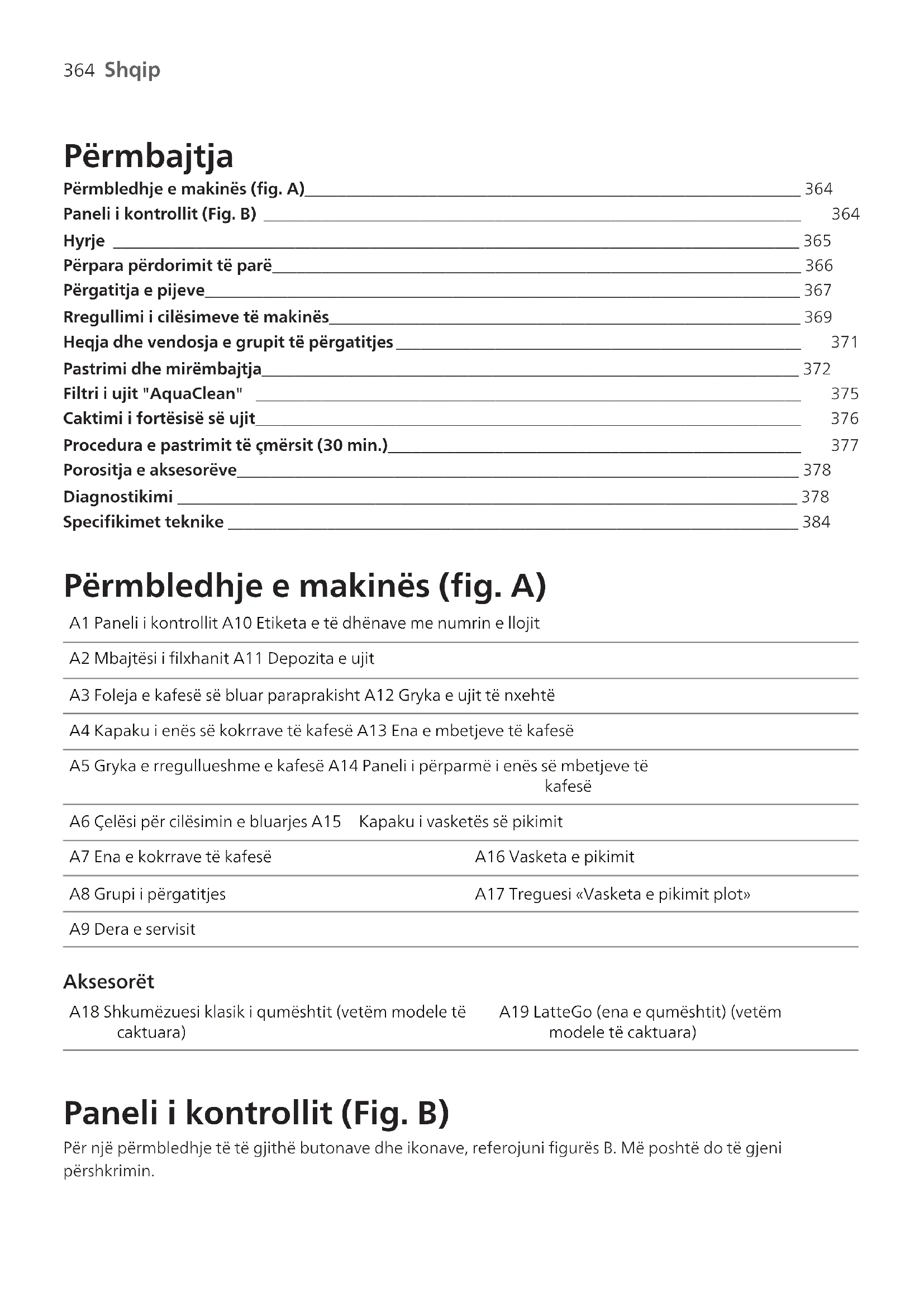 Shqip Shqip Përmbajtja Përmbledhje e makinës (fig. A)____________________________________________________________ 364 Paneli i kontrollit (Fig. B) _________________________________________________________________ 364 Hyrje ___________________________________________________________________________________ 365Përpara përdorimit të parë________________________________________________________________ 366Përgatitja e pijeve________________________________________________________________________ 367Rregullimi i cilësimeve të makinës_________________________________________________________ 369 Heqja dhe vendosja e grupit të përgatitjes _________________________________________________ 371 Pastrimi dhe mirëmbajtja_________________________________________________________________ 372 Filtri i ujit "AquaClean" __________________________________________________________________ 375 Caktimi i fortësisë së ujit__________________________________________________________________ 376 Procedura e pastrimit të çmërsit (30 min.)__________________________________________________ 377 Porositja e aksesorëve____________________________________________________________________ 378Diagnostikimi ___________________________________________________________________________ 378Specifikimet teknike _____________________________________________________________________ 384 Përmbledhje e makinës (fig. A) A1 Paneli i kontrollit A10 Etiketa e të dhënave me numrin e llojitA2 Mbajtësi i filxhanit A11 Depozita e ujitA3 Foleja e kafesë së bluar paraprakisht A12 Gryka e ujit të nxehtëA4 Kapaku i enës së kokrrave të kafesë A13 Ena e mbetjeve të kafesëA5 Gryka e rregullueshme e kafesë A14 Paneli i përparmë i enës së mbetjeve tëkafesëA6 Çelësi për cilësimin e bluarjes A15 Kapaku i vasketës së pikimitA7 Ena e kokrrave të kafesë A16 Vasketa e pikimitA8 Grupi i përgatitjes A17 Treguesi «Vasketa e pikimit plot»A9 Dera e servisit Aksesorët A18 Shkumëzuesi klasik i qumështit (vetëm modele tëcaktuara)A19 LatteGo (ena e qumështit) (vetëmmodele të caktuara) Paneli i kontrollit (Fig. B) Për një përmbledhje të të gjithë butonave dhe ikonave, referojuni figurës B. Më poshtë do të gjenipërshkrimin.365 Shqip Shqip Disa nga butonat/ikonat janë vetëm për modele të caktuara. B1 Butoni i ndezjes/fikjes B7 Ikonat paralajmëruese B2 Ikonat e pijeve* B8 Drita e ndezjes B3 Ikona e fortësisë së aromës/kafesë së bluar paraprakisht. B9 Butoni i ndezjes/fikjes B4 Ikona e sasisë së pijes B10 Ikona «Calc / Clean» (Pastrimi i Çmërsit) B5 Ikona e sasisë së qumështit (vetëm modele të caktuara) B11 Ikona «AquaClean» B6 Ikona e temperaturës së kafes (vetëm modele të caktuara) *Ikonat e pijeve: Espresso (Ekspres), Espresso lungo (ekspres i gjatë), Coffee (Kafe), Americano (Amerikano), Cappuccino (Kapuçino), Latte Macchiato (Makiato me Qumësht), hot water (ujë i nxehtë), steam (avull) (vetëm modele të caktuara) Hyrje Ju përgëzojmë për blerjen e makinerisë të kafesë plotësisht automatike «Philips»! Për të përfituar plotësisht nga ndihma që ne ofrojmë, ju lutem regjistrojeni produktin tuaj në www.home.id. Lexoni me kujdes broshurën e veçantë të sigurisë para se të përdorni makinën për herë të parë dhe ruajeni atë për referencë në të ardhmen. Para përdorimit të parë, shpëlani me ujë të nxehtë të gjithë aksesorët e heqshëm që mund të bien në kontakt me ujin ose qumështin. Për t'ju ndihmuar me hapat e parë dhe që të merrni maksimumin nga makineria juaj, ne ofrojmë ndihmë në disa mënyra. Në kuti mund të gjeni: 1 Manuali i përdorimit me udhëzime përmes figurave dhe informacione më të detajuara lidhur me pastrimin dhe mirëmbajtjen. 2 Broshurën e veçantë të sigurisë me udhëzime për përdorimin e makinerisë në mënyrë të sigurt. 3 Për ndihmë në internet (ky manual përdorimi i zgjeruar, pyetjet e shpeshta, videot etj.), skanoni kodin QR në kopertinën e kësaj broshure për të shkarkuar aplikacionin HomeID ose vizitoni faqen www.home.id/support. Për këtë aparat ekspresi ekzistojnë disa versione, të gjitha me karakteristika të ndryshme. Secili version përmban një numër lloji. Numrin e llojit mund ta gjeni në etiketën e të dhënave në pjesën e brendshme të derës së shërbimit (shihni Fig. A9). Kjo makineri është testuar me kafe. Ndonëse është pastruar me kujdes, mund të ketë mbetje kafeje. Megjithatë, ju garantojmë se makina është absolutisht e re. Makineria rregullon automatikisht sasinë e kafesë së bluar që përdoret për të bërë kafenë me shijen më të përsosur. Përgatisni fillimisht 5 kafe për t'i dhënë mundësi aparatit të përfundojë procedurën e vetëpërshtatjes. Sigurohuni që të shpëlani LatteGo (enën e qumështit) ose shkumëzuesin klasik të qumështit përpara përdorimit për herë të parë.366 Shqip Përpara përdorimit të parë