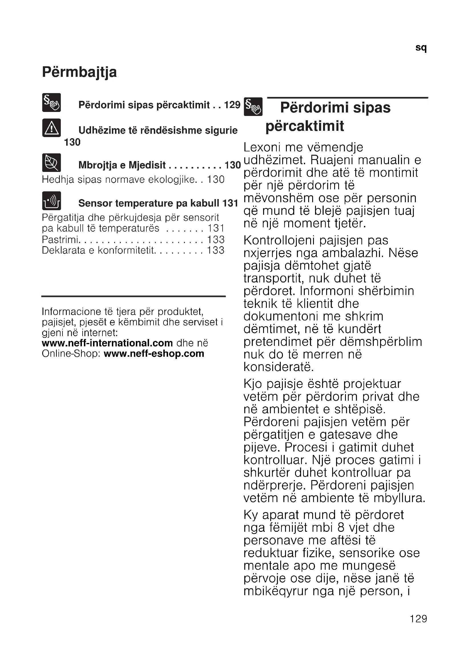 - Deklarata e konformitetit Info për produktet Informacione të tjera për produktet, pajisjet, pjesët e këmbimit dhe serviset i gjeni në internet: www.neff-international.com dhe në Online-Shop: www.neff-eshop.com 8 Përdorimi sipas përcaktimit Përdorimi sipas përcaktimit Lexoni me vëmendje udhëzimet. Ruajeni manualin e përdorimit dhe atë të montimit për një përdorim të mëvonshëm ose për personin që mund të blejë pajisjen tuaj në një moment tjetër. Kontrollojeni pajisjen pas nxjerrjes nga ambalazhi. Nëse pajisja dëmtohet gjatë transportit, nuk duhet të përdoret. Informoni shërbimin teknik të klientit dhe dokumentoni me shkrim dëmtimet, në të kundërt pretendimet për dëmshpërblim nuk do të merren në konsideratë. Kjo pajisje është projektuar vetëm për përdorim privat dhe në ambientet e shtëpisë. Përdoreni pajisjen vetëm për përgatitjen e gatesave dhe pijeve. Procesi i gatimit duhet kontrolluar. Një proces gatimi i shkurtër duhet kontrolluar pa ndërprerje. Përdoreni pajisjen vetëm në ambiente të mbyllura. Ky aparat mund të përdoret nga fëmijët mbi 8 vjet dhe personave me aftësi të reduktuar fizike, sensorike ose mentale apo me mungesë përvoje ose dije, nëse janë të mbikëqyrur nga një person, isq p. 133