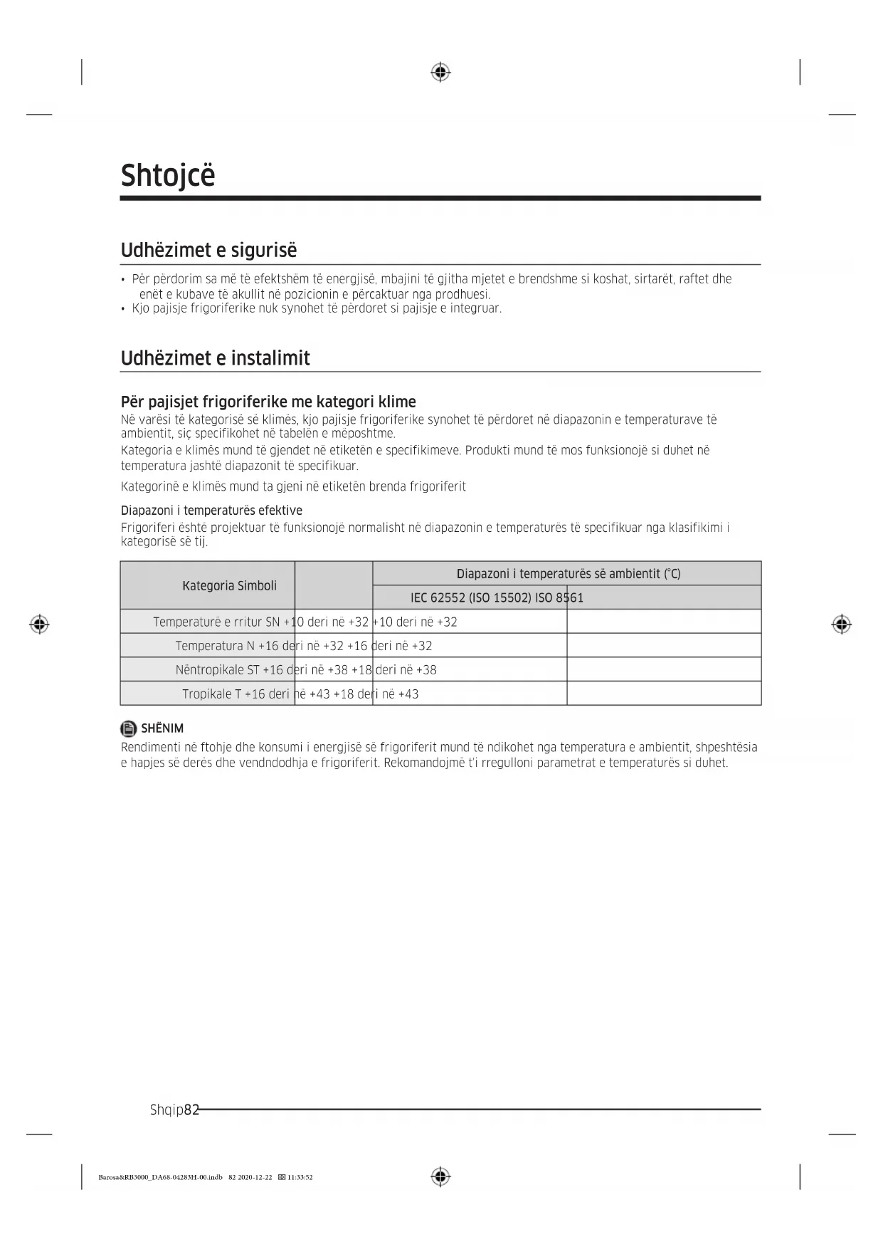Temperaturë e rritur SN +10 deri në +32 +10 deri në +32 Temperatura N +16 deri në +32 +16 deri në +32 Nëntropikale ST +16 deri në +38 +18 deri në +38 Tropikale T +16 deri në +43 +18 deri në +43 SHËNIM Rendimenti në ftohje dhe konsumi i energjisë së frigoriferit mund të ndikohet nga temperatura e ambientit, shpeshtësia e hapjes së derës dhe vendndodhja e frigoriferit. Rekomandojmë t'i rregulloni parametrat e temperaturës si duhet. Barosa&RB3000_DA68-04283H-00.indb 82 2020-12-22 11:33:52Shqip 83 Udhëzimet për temperaturat Temperatura e rekomanduar Cilësimet e temperaturës optimale për ruajtjen e ushqimeve: