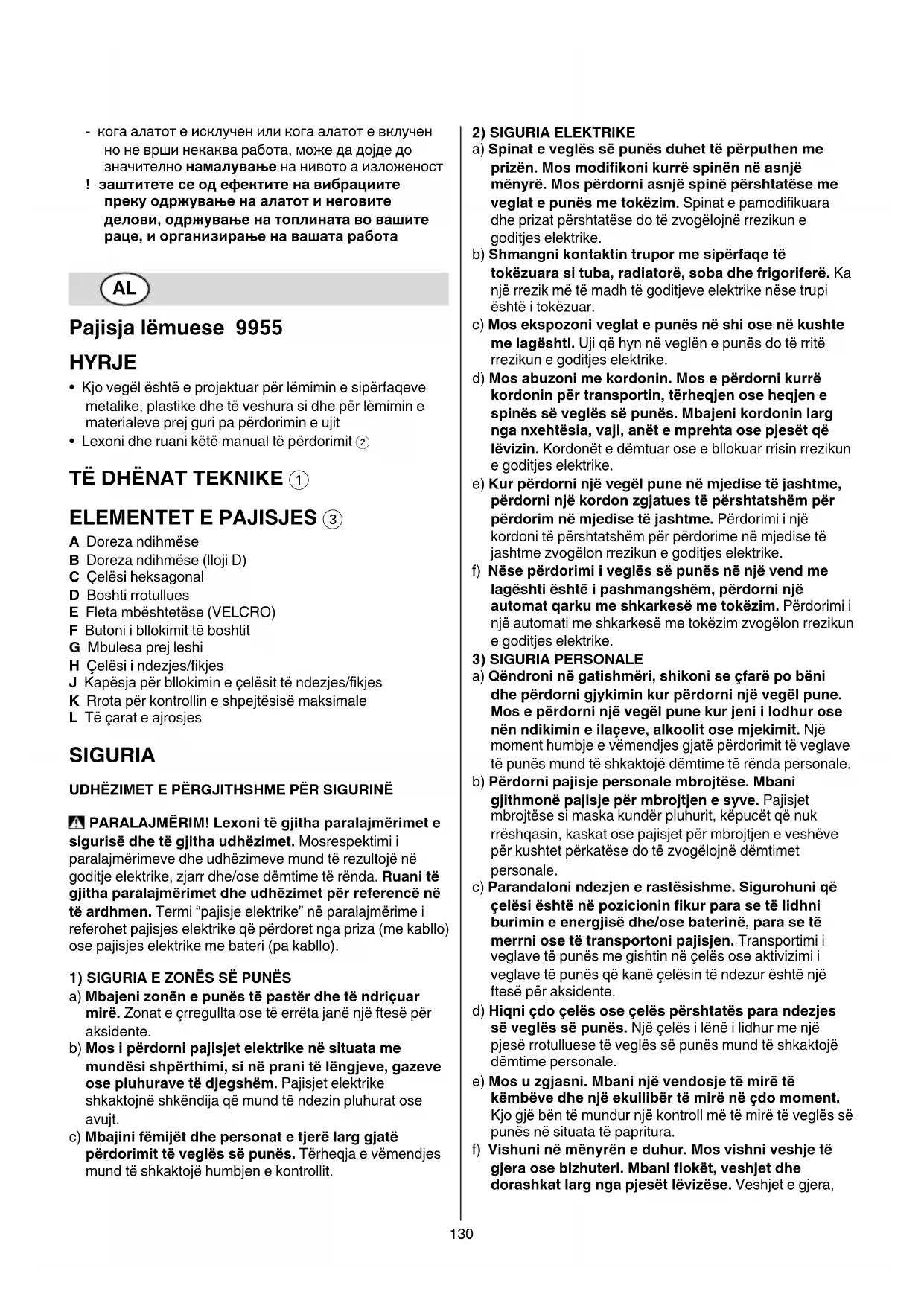 i) Pērdorni pajisje personale mbrojtëse 4. Né varësi tê punës, pērdorni mbrojtëse per fytyrén, syze ose maska sigurie. Sipas nevojës, mbani maska per pluhurat, mbrojtëse per degjimin, doreza dhe perparëse pune që mund të ndalojnë fragmentet e vogla gërryese ose të materialit tê punës. Mbrojtësete syve duhet të arrijnë të ndalojnë copezat që fluturojne të krijuara nga pērdorimet e ndryshme. Maska e pluhurave ose respiratori duhet të arrijnë të filtrojne grimcat e krijuara nga veprimi juaj. Ekspozimi i gjatë ndaj zhurmave me intensitet të larte mund të shkaktojë humbje të degjimit.
