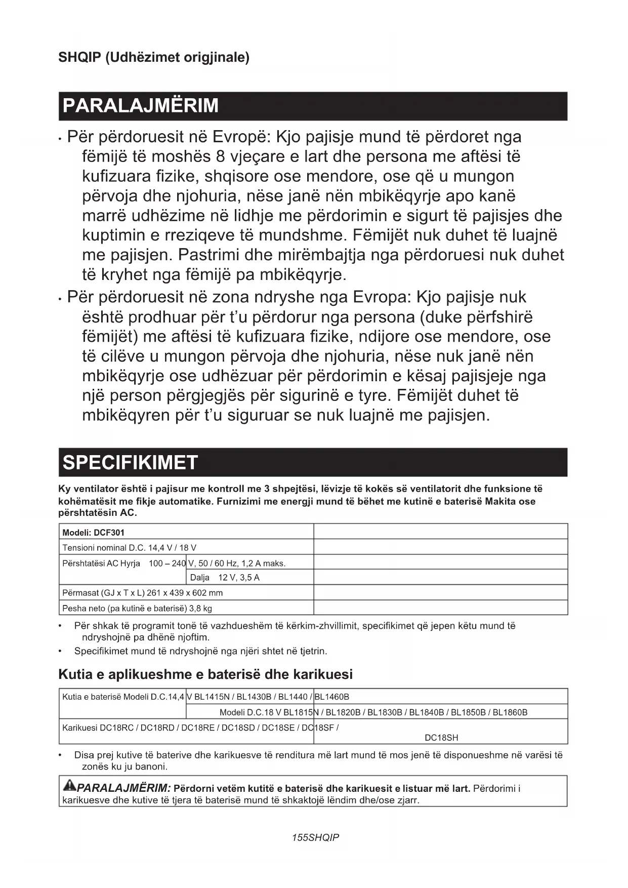 - PërpërdoruesitnëzonandryshengaEvropa:Kjopajisjenuk është prodhuar për t’u përdorur nga persona (duke përfshirë fëmijët)meaftësitëkuzuarazike,ndijoreosemendore,ose tëcilëveumungonpërvojadhenjohuria,nësenukjanënën mbikëqyrjeoseudhëzuarpërpërdoriminekësajpajisjejenga njëpersonpërgjegjëspërsigurinëetyre.Fëmijëtduhettë mbikëqyrenpërt’usiguruarsenukluajnëmepajisjen. SPECIFIKIMET Ky ventilator është i pajisur me kontroll me 3 shpejtësi, lëvizje të kokës së ventilatorit dhe funksione të kohëmatësit me kje automatike. Furnizimi me energji mund të bëhet me kutinë e baterisë Makita ose përshtatësin AC. Modeli: DCF301Tensioni nominal D.C. 14,4 V / 18 VPërshtatësi AC Hyrja 100 – 240 V, 50 / 60 Hz, 1,2 A maks.Dalja 12 V, 3,5 APërmasat (GJ x T x L) 261 x 439 x 602 mmPesha neto (pa kutinë e baterisë) 3,8 kg