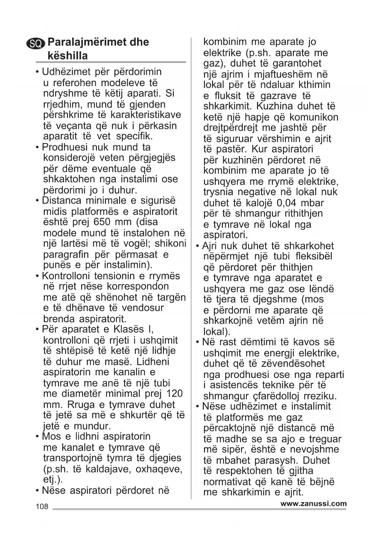 - Nëse udhëzimet e instalimit të platformës me gaz përcaktojnë një distancë më të madhe se sa ajo e treguar më sipër, është e nevojshme të mbahet parasysh. Duhet të respektohen të gjitha normativat që kanë të bëjnë me shkarkimin e ajrit. SQ109 www.zanussi.com