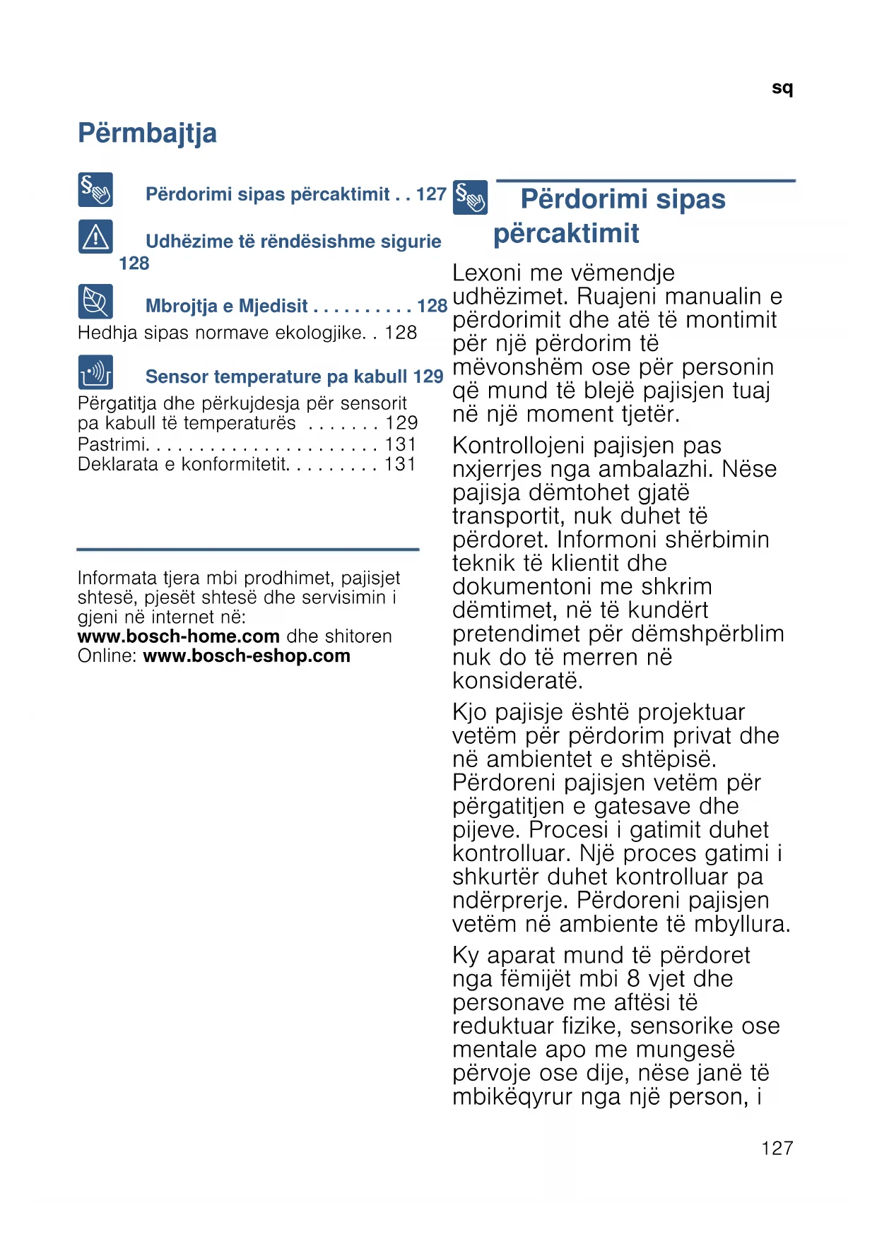 Përmbajtja sqUdhëzim për përdorim 8 Përdorimi sipas përcaktimit . . 127 ( Udhëzime të rëndësishme sigurie
