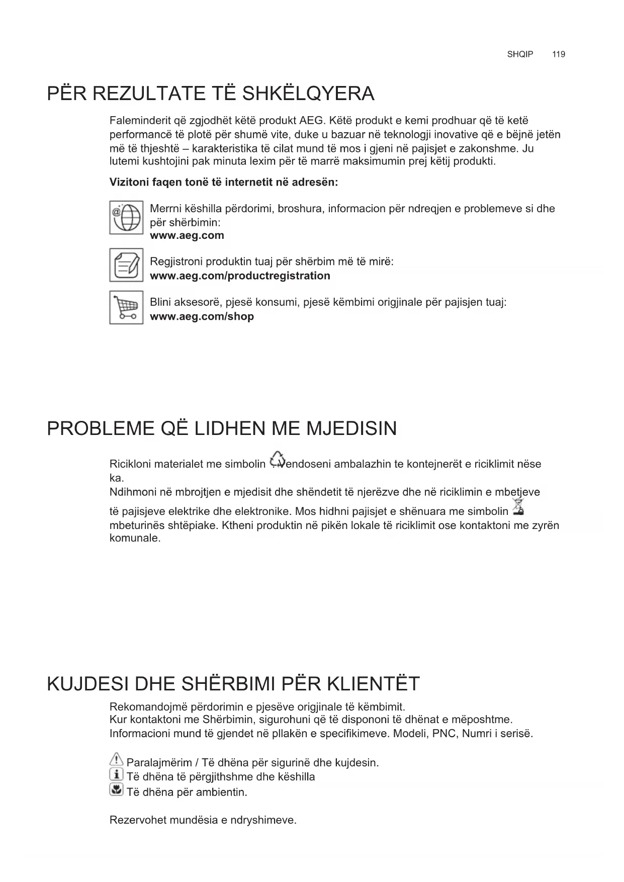 Faleminderit që zgjodhët këtë produkt AEG. Këtë produkt e kemi prodhuar që të ketë performancë të plotë për shumë vite, duke u bazuar në teknologji inovative që e bëjnë jetën më të thjeshtë – karakteristika të cilat mund të mos i gjeni në pajisjet e zakonshme. Ju lutemi kushtojini pak minuta lexim për të marrë maksimumin prej këtij produkti. Vizitoni faqen tonë të internetit në adresën: Merrni këshilla përdorimi, broshura, informacion për ndreqjen e problemeve si dhe për shërbimin: www.aeg.com Regjistroni produktin tuaj për shërbim më të mirë: www.aeg.com/productregistration Blini aksesorë, pjesë konsumi, pjesë këmbimi origjinale për pajisjen tuaj: www.aeg.com/shop