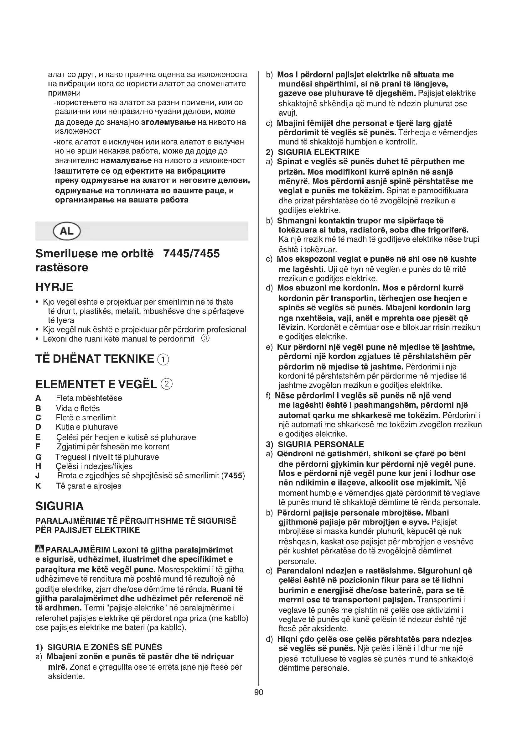 A Fleta mbështetëse B Vida e etës C Fletë e smerilimit D Kutia e pluhurave E Çelësi për heqjen e kutisë së pluhurave F Zgjatimi për fshesën me korrent G Treguesi i nivelit të pluhurave H Çelësi i ndezjes/kjes J Rrota e zgjedhjes së shpejtësisë së smerilimit (7455) K Të çarat e ajrosjes SIGURIA PARALAJMËRIME TË PËRGJITHSHME TË SIGURISË