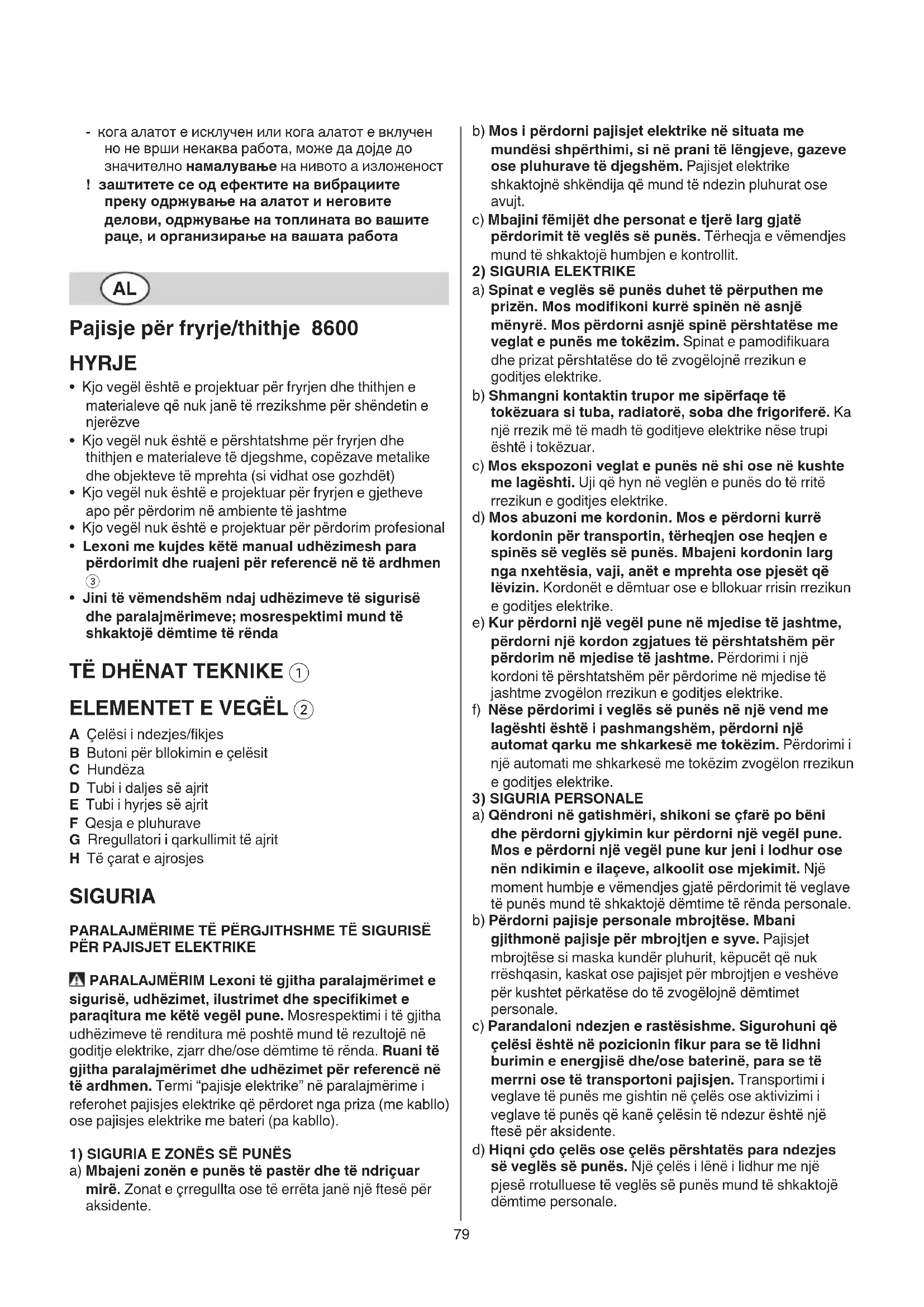 h) Mos lejoni që familjarizimi i fituar nga përdorimi i shpeshtë i veglave t'ju lejojë të tregoheni të vetëkënaqur dhe të shpërfillni parimet e sigurisë për pajisjet. Një veprim i pakujdesshëm mund të shkaktojë dëmtime të rënda në më pak se një sekondë.