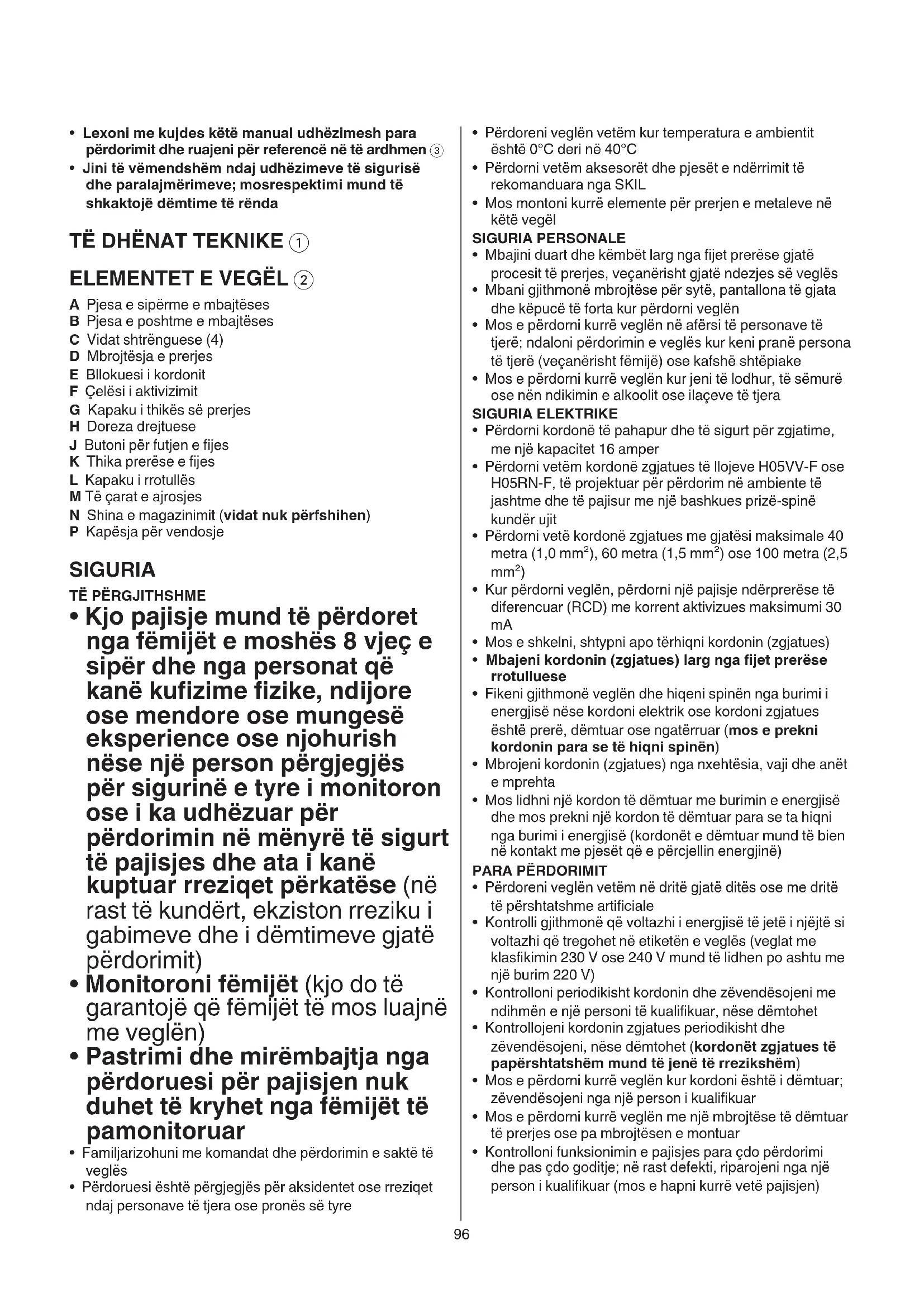 3 Paralajmërim! Lexoni manualin e udhëzimeve 4 Mos e ekspozoni veglën në shi 5 Mbani syze mbrojtëse dhe pajisje mbrojtëse për dëgjimin 6 Jini të vëmendshëm ndaj rrezikut për dëmtime nga copat që fluturojnë përreth (mbajini personat e tjerë në një distancë të sigurt nga zona e punës) 7 Hiqni menjëherë spinën nëse kordoni (zgjatues) dëmtohet ose pritet gjatë punës 8 Izolim i dyfishtë (nuk kërkohet tokëzim) 9 Mos e hidhni veglën bashkë me materialet e mbetjeve familjare PËRDORIMI
