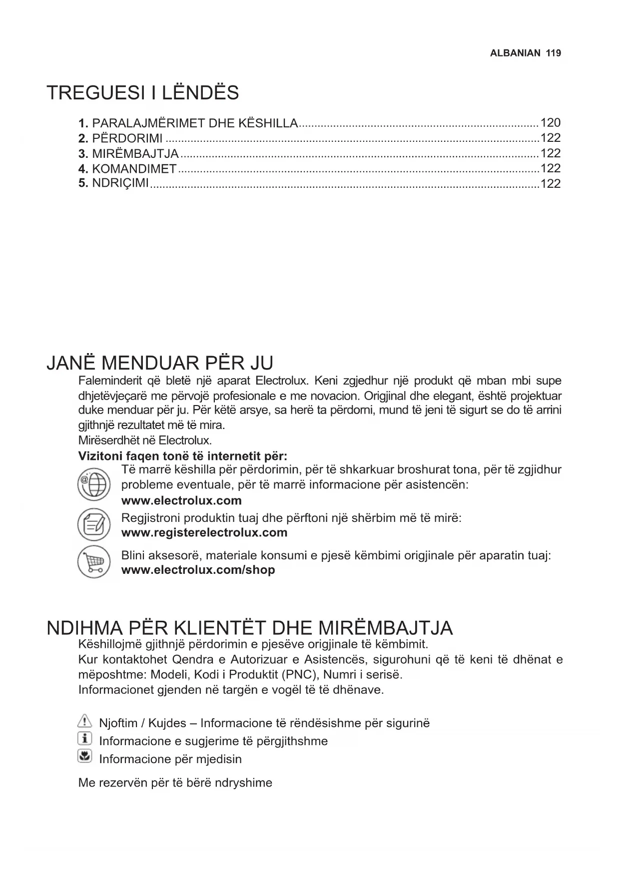 Faleminderit që bletë një aparat Electrolux. Keni zgjedhur një produkt që mban mbi supe dhjetëvjeçarë me përvojë profesionale e me novacion. Origjinal dhe elegant, është projektuar duke menduar për ju. Për këtë arsye, sa herë ta përdorni, mund të jeni të sigurt se do të arrini gjithnjë rezultatet më të mira. Mirëserdhët në Electrolux. Vizitoni faqen tonë të internetit për: Të marrë këshilla për përdorimin, për të shkarkuar broshurat tona, për të zgjidhur probleme eventuale, për të marrë informacione për asistencën: www.electrolux.com Regjistroni produktin tuaj dhe përftoni një shërbim më të mirë: www.registerelectrolux.com Blini aksesorë, materiale konsumi e pjesë këmbimi origjinale për aparatin tuaj: www.electrolux.com/shop NDIHMA PËR KLIENTËT DHE MIRËMBAJTJA Këshillojmë gjithnjë përdorimin e pjesëve origjinale të këmbimit. Kur kontaktohet Qendra e Autorizuar e Asistencës, sigurohuni që të keni të dhënat e mëposhtme: Modeli, Kodi i Produktit (PNC), Numri i serisë. Informacionet gjenden në targën e vogël të të dhënave. Njoftim / Kujdes – Informacione të rëndësishme për sigurinë Informacione e sugjerime të përgjithshme Informacione për mjedisin Me rezervën për të bërë ndryshime120 www.electrolux.com