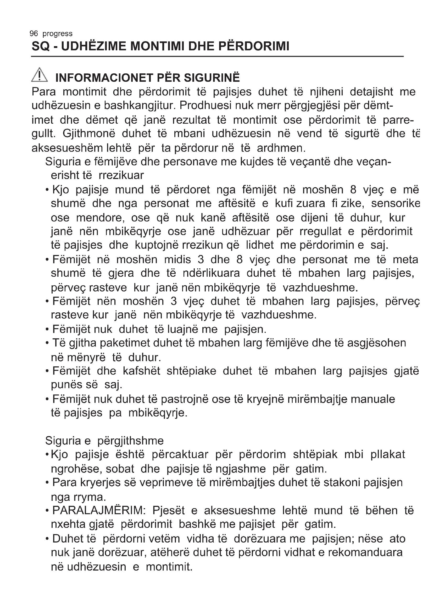 - Fëmijët nën moshën 3 vjeç duhet të mbahen larg pajisjes, përveç rasteve kur janë nën mbikëqyrje të vazhdueshme.