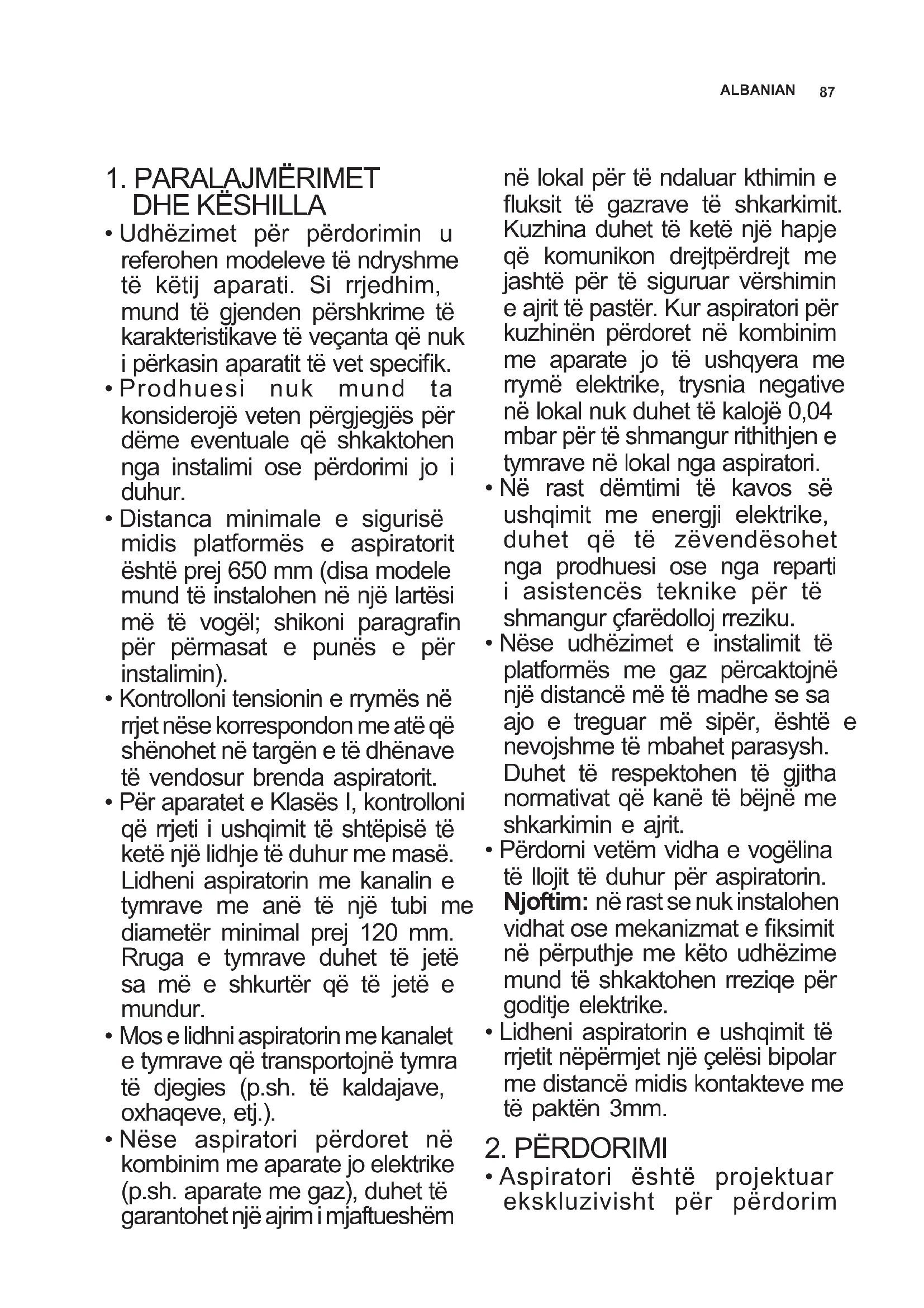 - Nëse aspiratori përdoret në kombinim me aparate jo elektrike (p.sh. aparate me gaz), duhet të garantohet një ajrim i mjaftueshëm në lokal për të ndaluar kthimin e uksit të gazrave të shkarkimit. Kuzhina duhet të ketë një hapje që komunikon drejtpërdrejt me jashtë për të siguruar vërshimin e ajrit të pastër. Kur aspiratori për kuzhinën përdoret në kombinim me aparate jo të ushqyera me rrymë elektrike, trysnia negative në lokal nuk duhet të kalojë 0,04 mbar për të shmangur rithithjen e tymrave në lokal nga aspiratori.